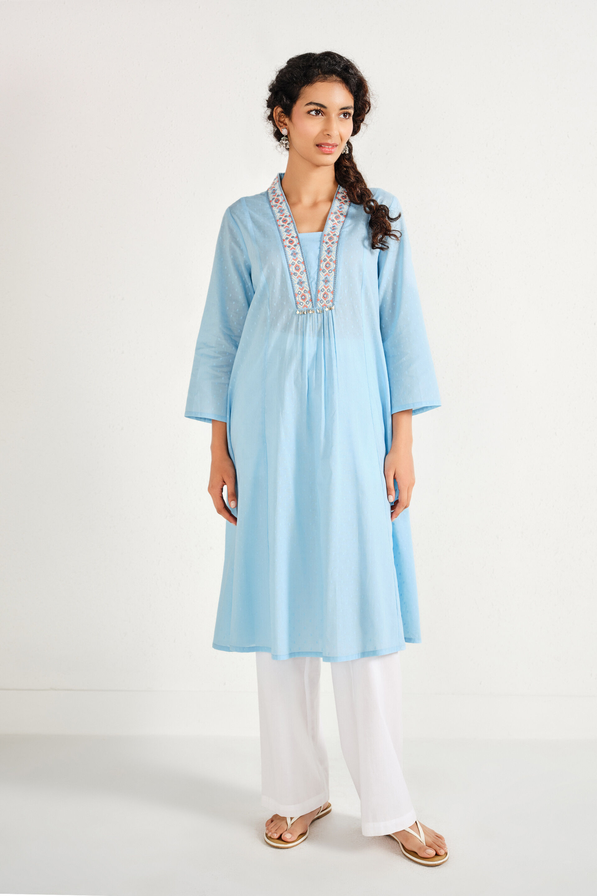 A sky blue kurta in pure cotton featuring a V neckline with dori detail, 3/4 sleeves, an A-line silhouette, and pleats.