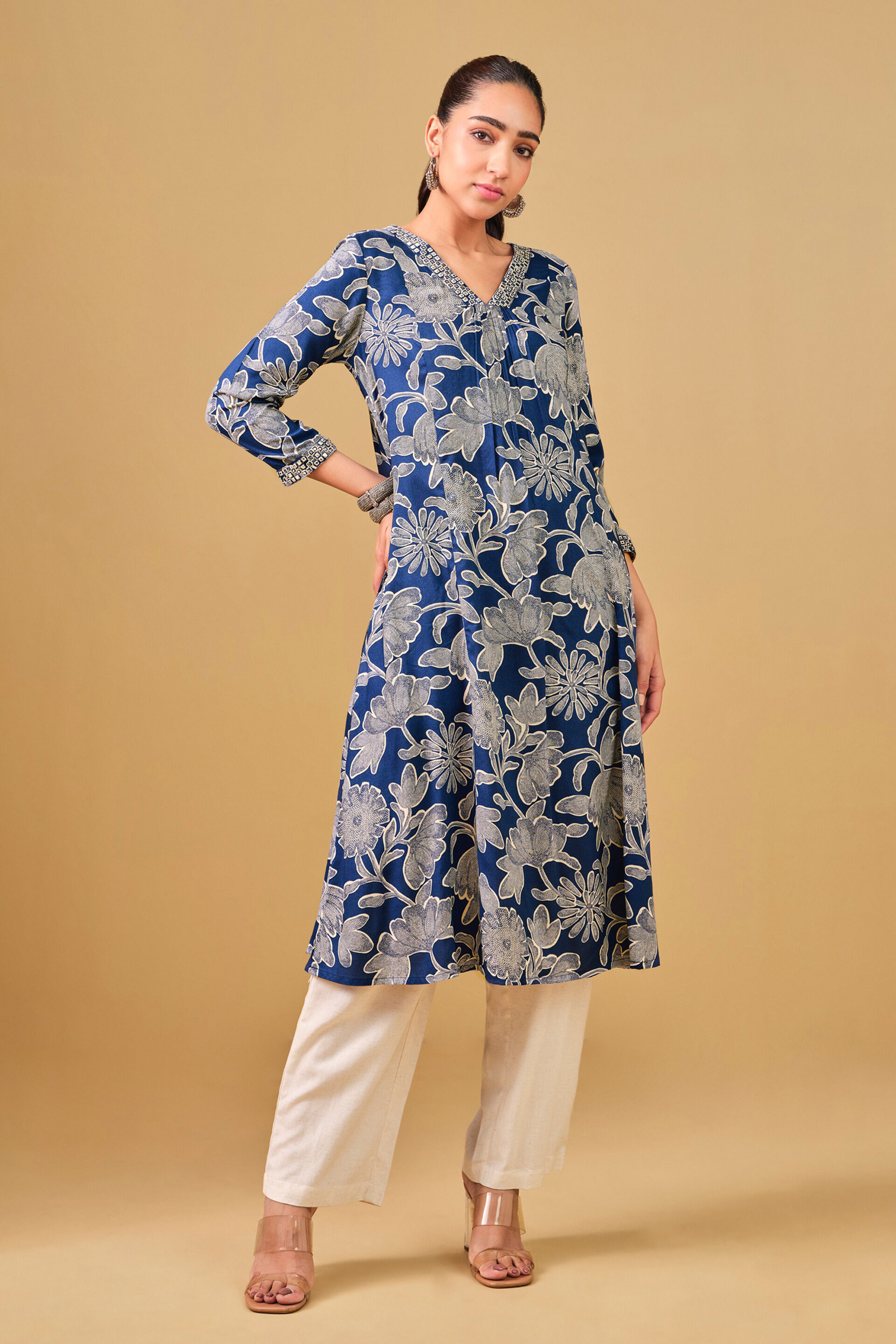Embrace the blues this summer with this gorgeous floral printed 100% viscose kurta. Featuring abstract floral prints with delicate embroidery and mirror work along the neckline and sleeves, this kurta is all about the summer vibes.