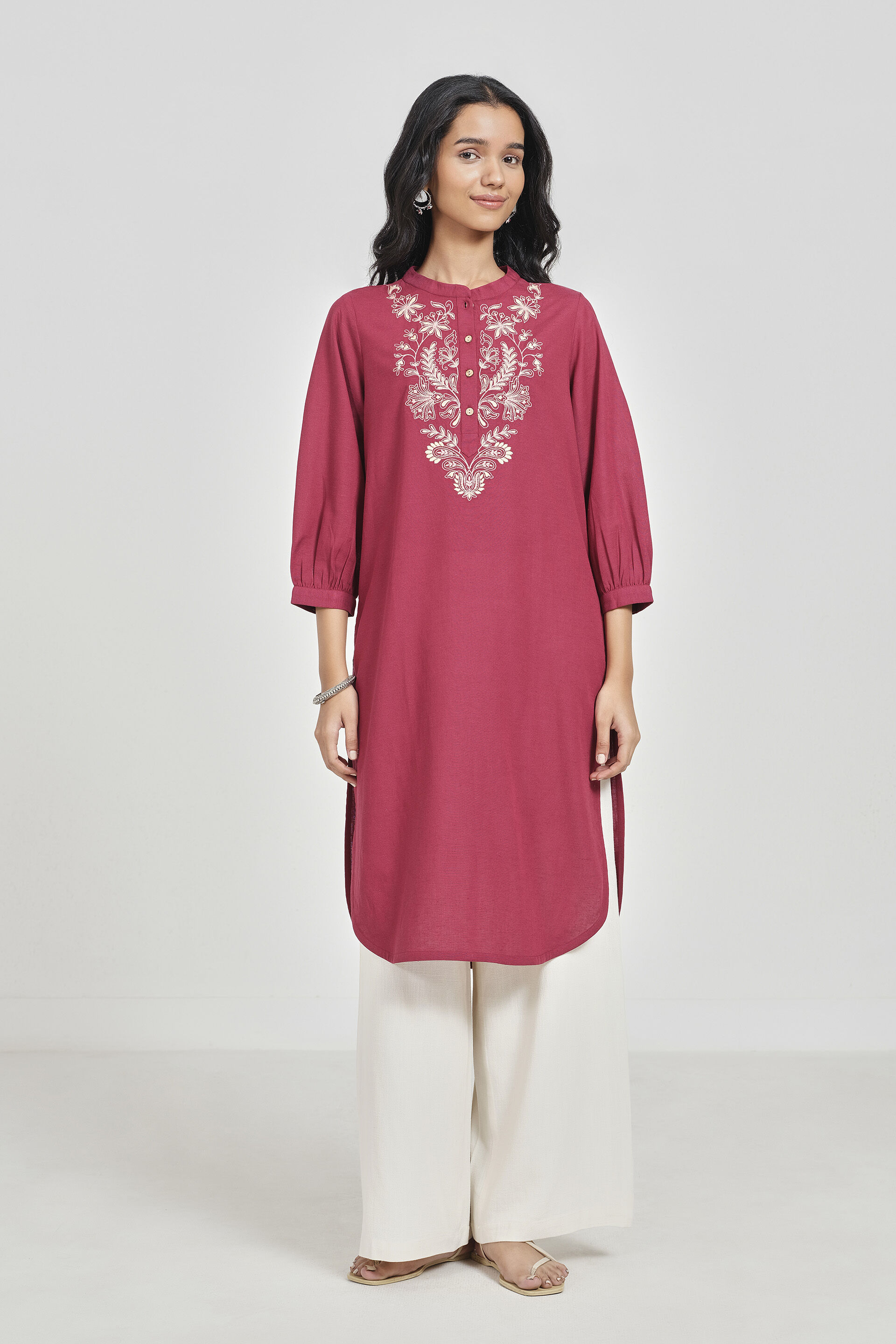 A mid-calf straight kurta in maroon featuring a band collar with front placket, three-quarter cuffed sleeves, and delicate embroidery. Designed with a rounded apple hem for a flattering finish.