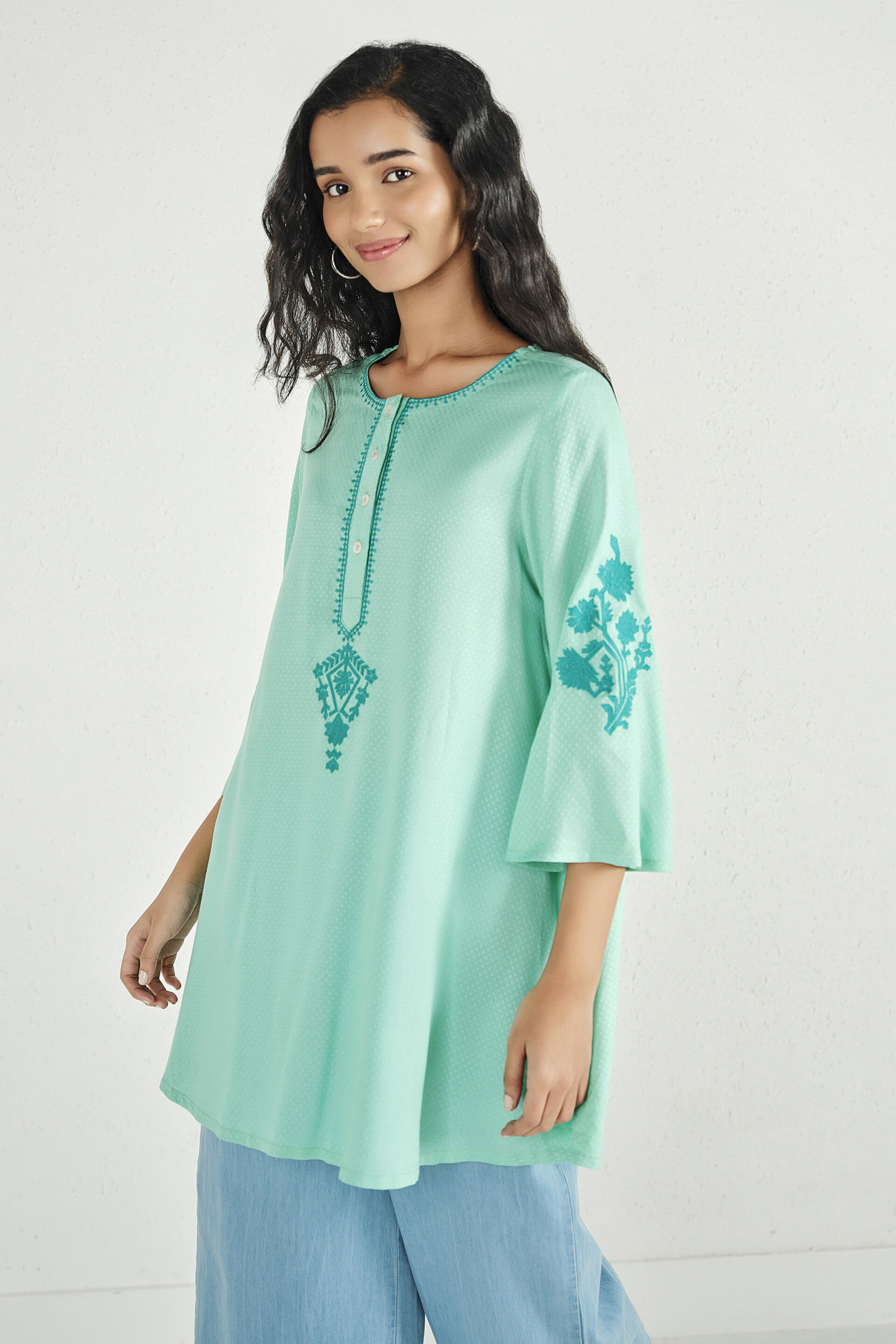 A mint-coloured tunic designed with a round neckline, front placket, three-quarter sleeves, mid-thigh length, and a straight silhouette.