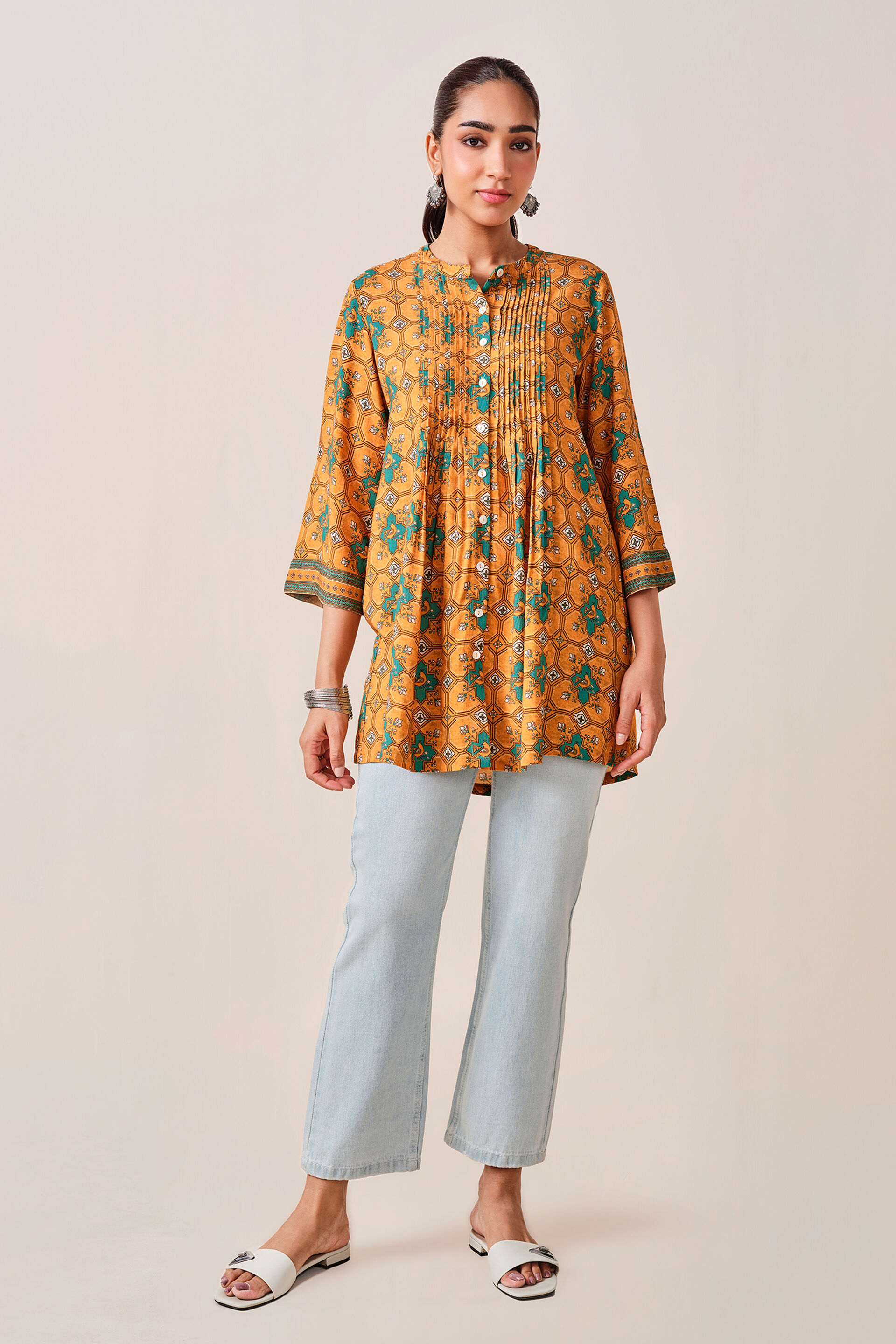 Add a playful twist to your on-duty look with this eclectic shirt-style printed tunic that's crafted with 100% viscose. Pair it with light denims or white trousers for a sophisticated look.