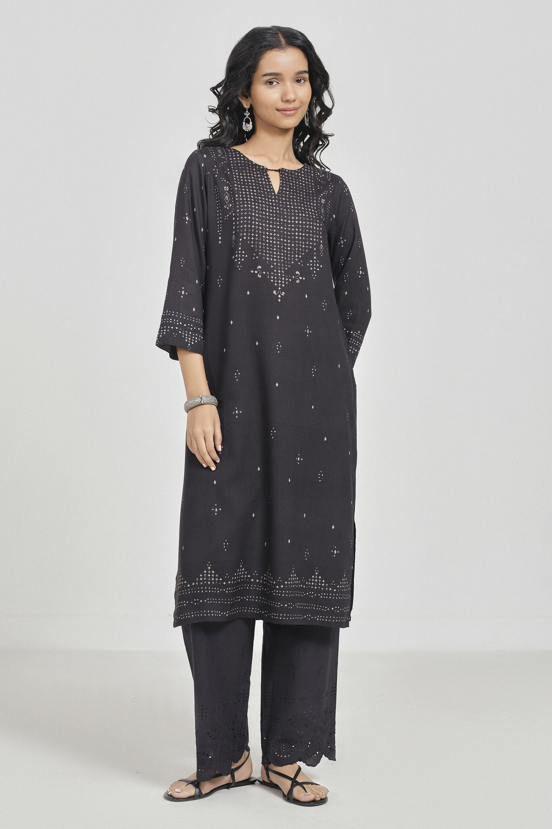 A black straight kurta designed with a round neckline and placket, three-quarter sleeves, mid-calf length, and a slip-in fit.