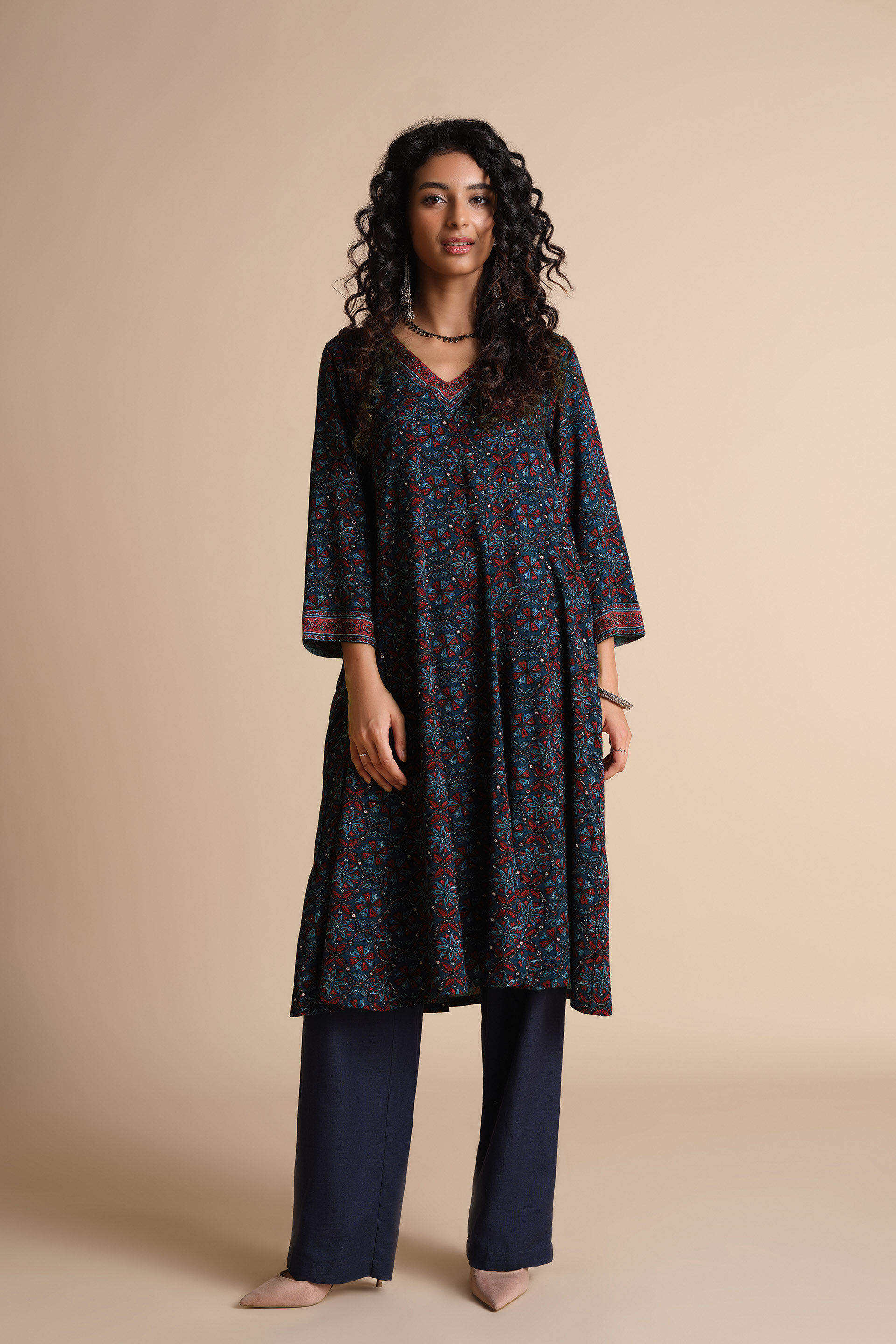 Fuss-free and easy to style, this fit-and-flare kurta features India-inspired prints. Crafted in a soft & breathable viscose fabric, this kurta comes with three-quarter sleeves & V-neckline. Style this kurta with straight pants at work and with flared pants for the weekend.