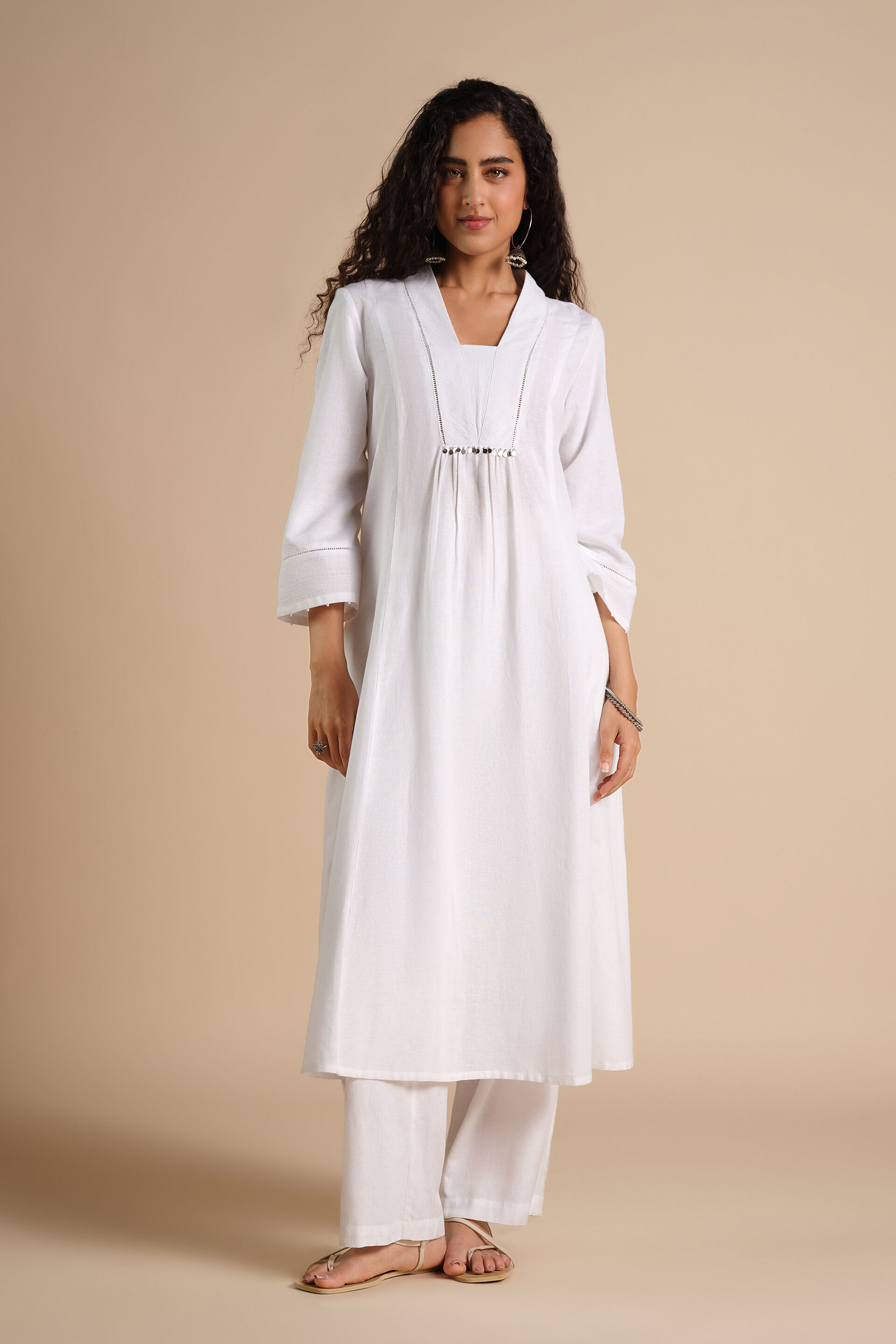 For days you're in the mood to keep it relaxed, go for this fuss-free and elegant kurta. Featuring India-inspired embroidery and prints, this ensemble comes with three-quarter sleeves, V-neckline and a fit-and-flare silhouette. Crafted in a viscose linen blend, this ensemble offers ease of movement & all-day comfort. Pair it with silver bangles & trailing earrings to complete your look.