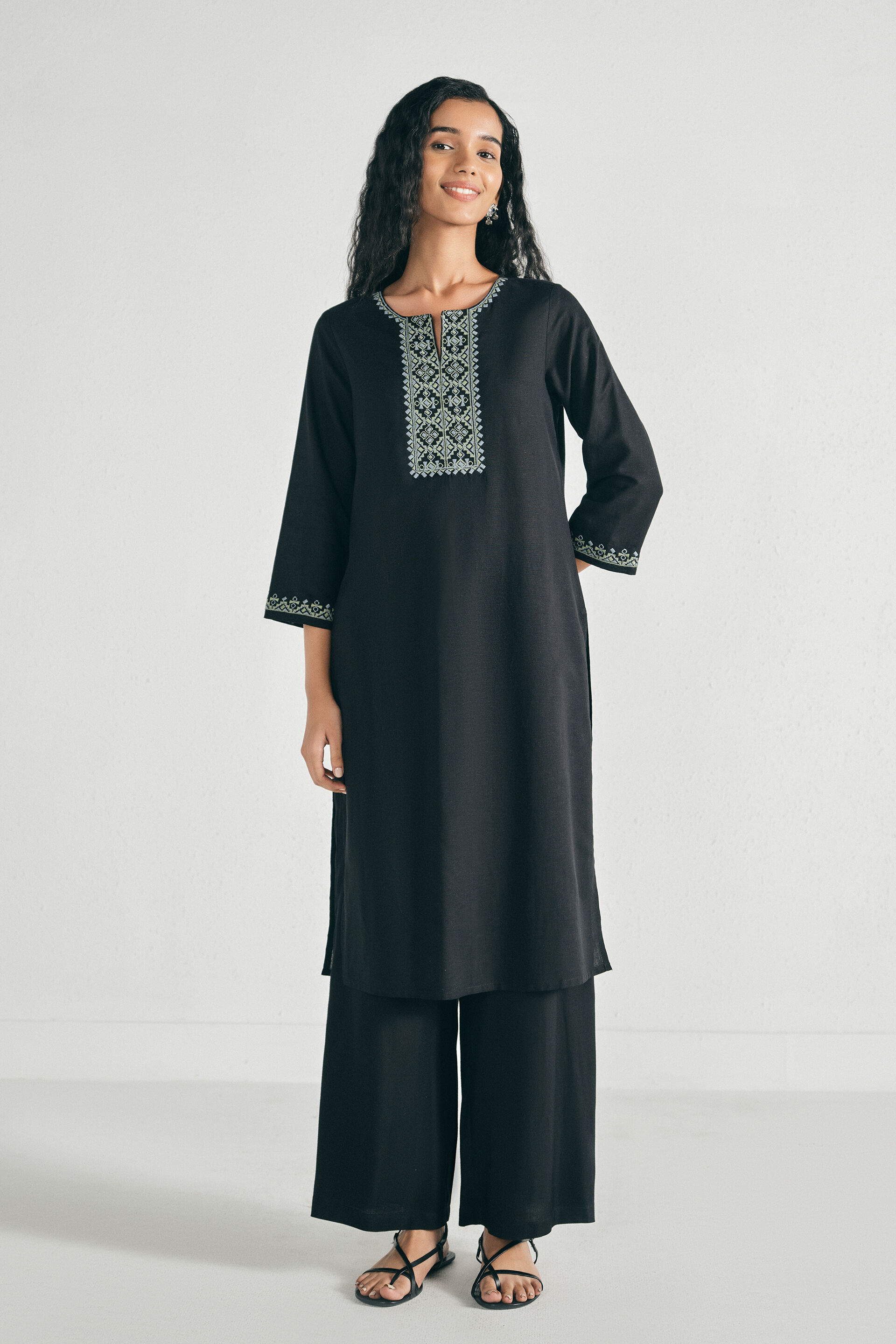 A black-coloured straight kurta featuring a round neckline with slit and embroidery detail, three-quarter sleeves, mid-calf length, and a slip-in fit.