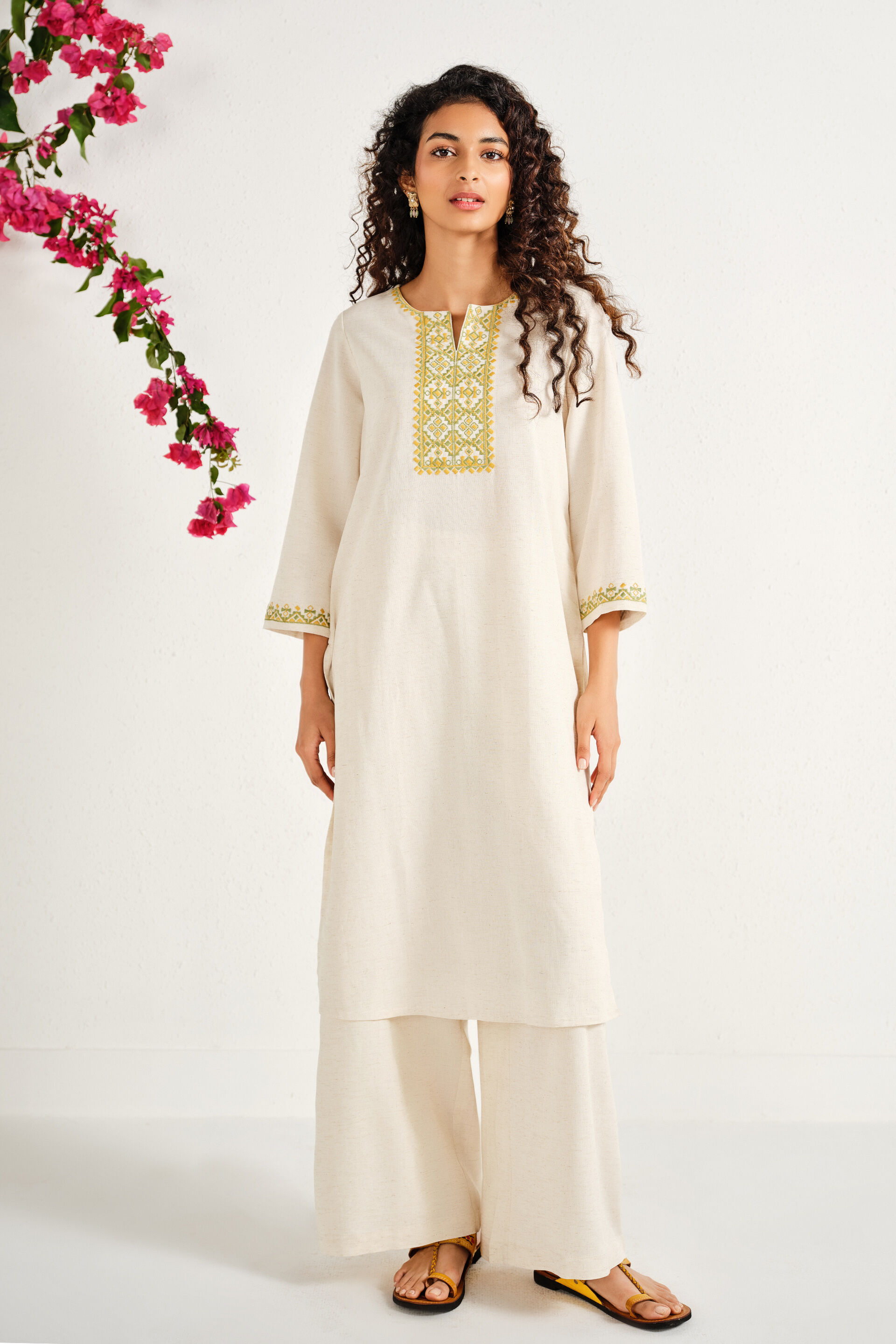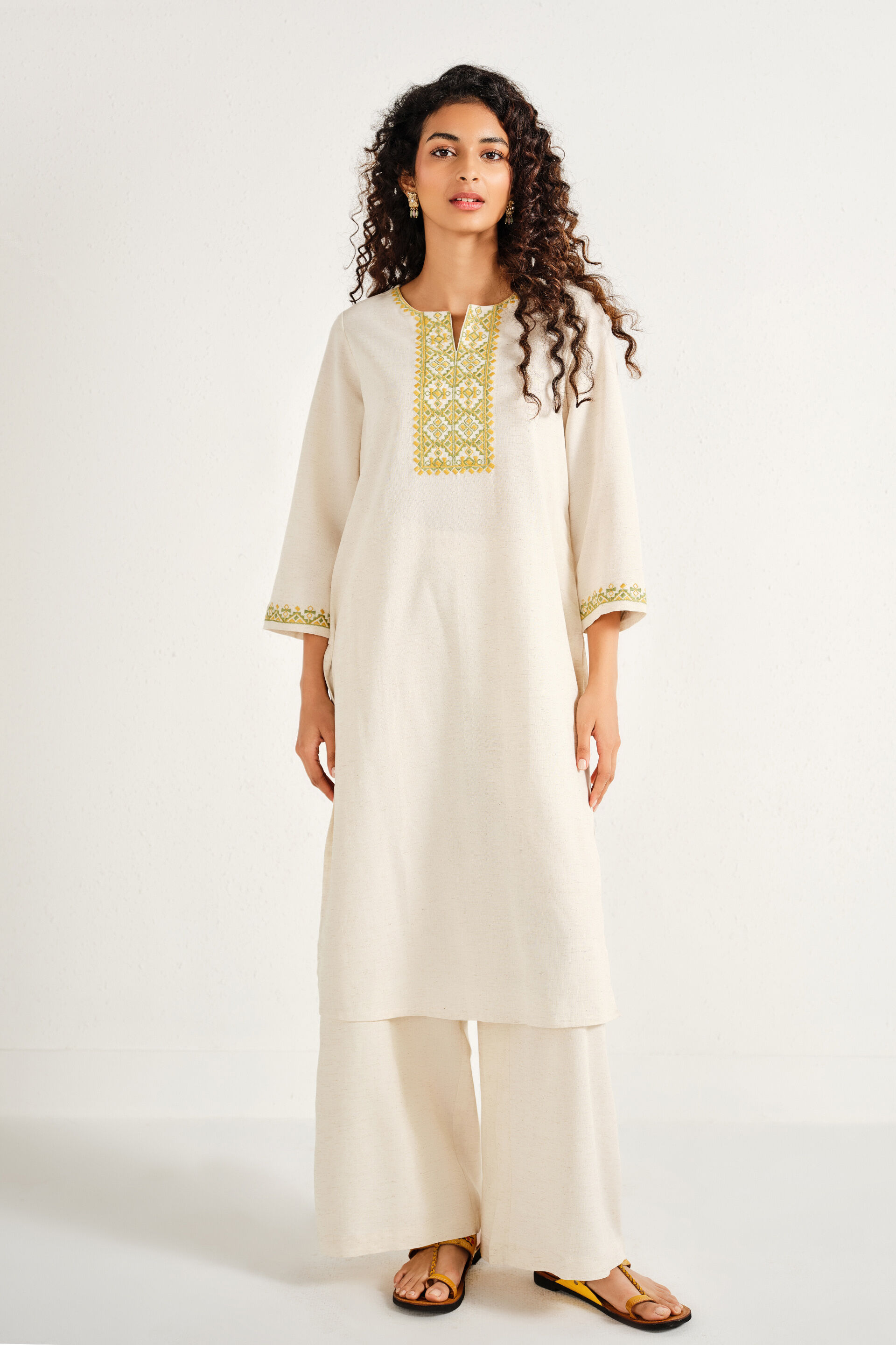A natural-coloured straight kurta featuring a round neckline with slit and embroidery detail, three-quarter sleeves, mid-calf length, and a slip-in fit.