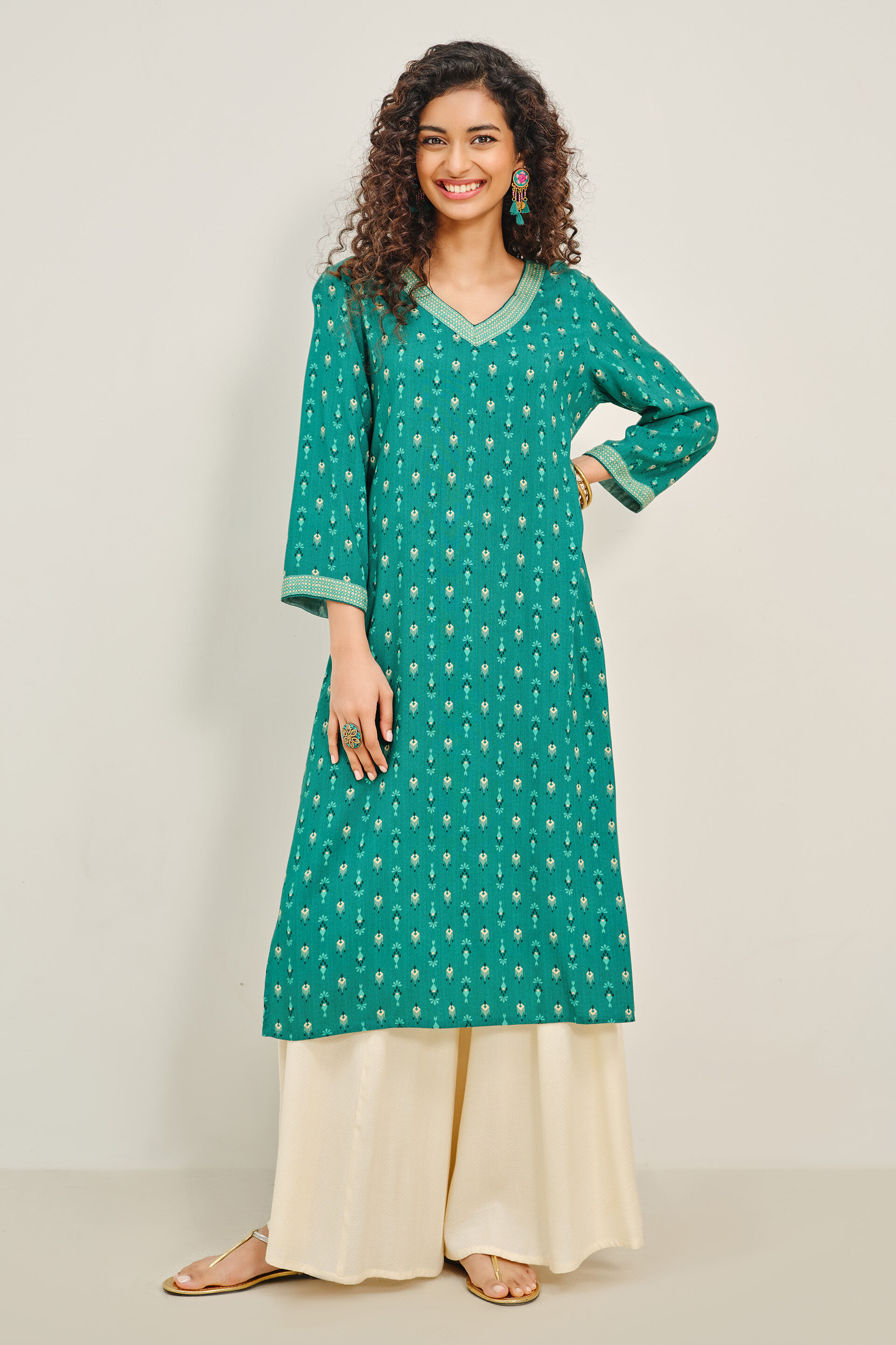 This kurta in soft viscose features a flattering V-neck and three-quarter sleeves. With its easy print and straight silhouette, it’s your go-to for everything from morning errands to casual meet-ups.