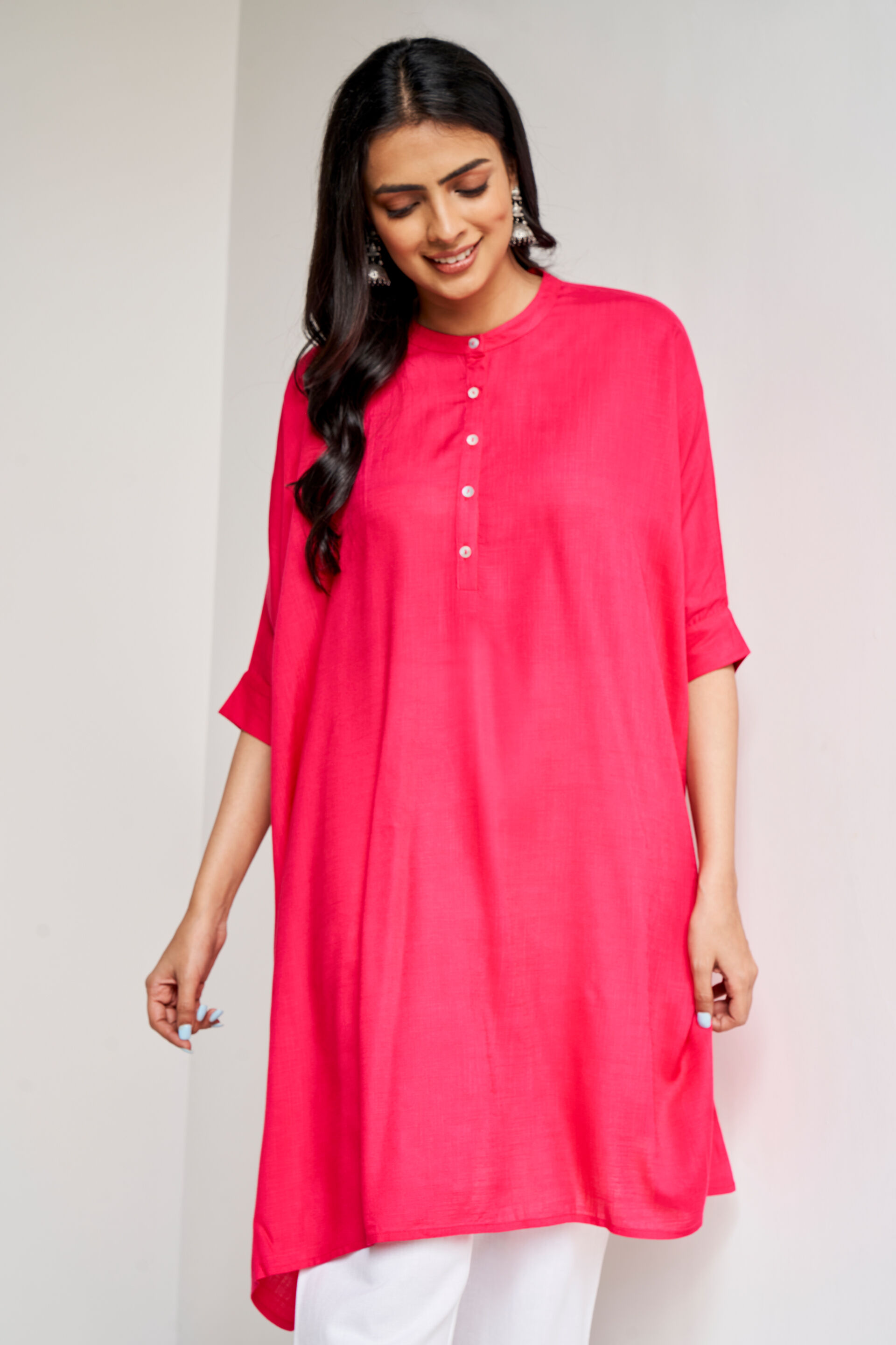 Make your ethnic wear more fun with this elegant kurta for women from Global Desi. Crafted from solid hot pink soft viscose fabric in a loose fit contour with drooping shoulders, elbow-length sleeves and a button placket. Pair this stylish kurta with white bottoms and dangling earrings.