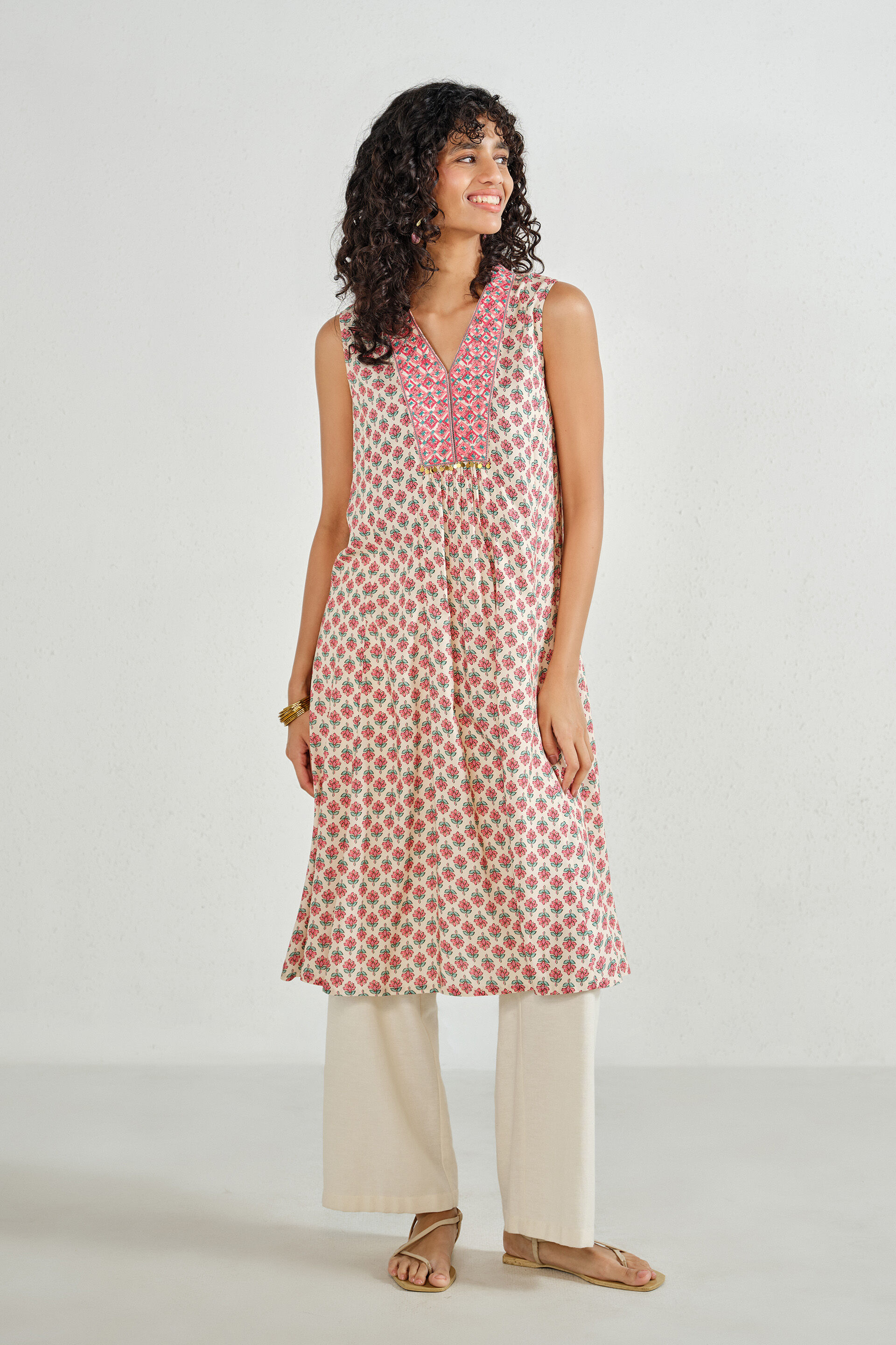 A pleated pink A-line kurta featuring a V-neckline with gathered detailing, sleeveless silhouette, mid-calf length, and front button-up closure.
