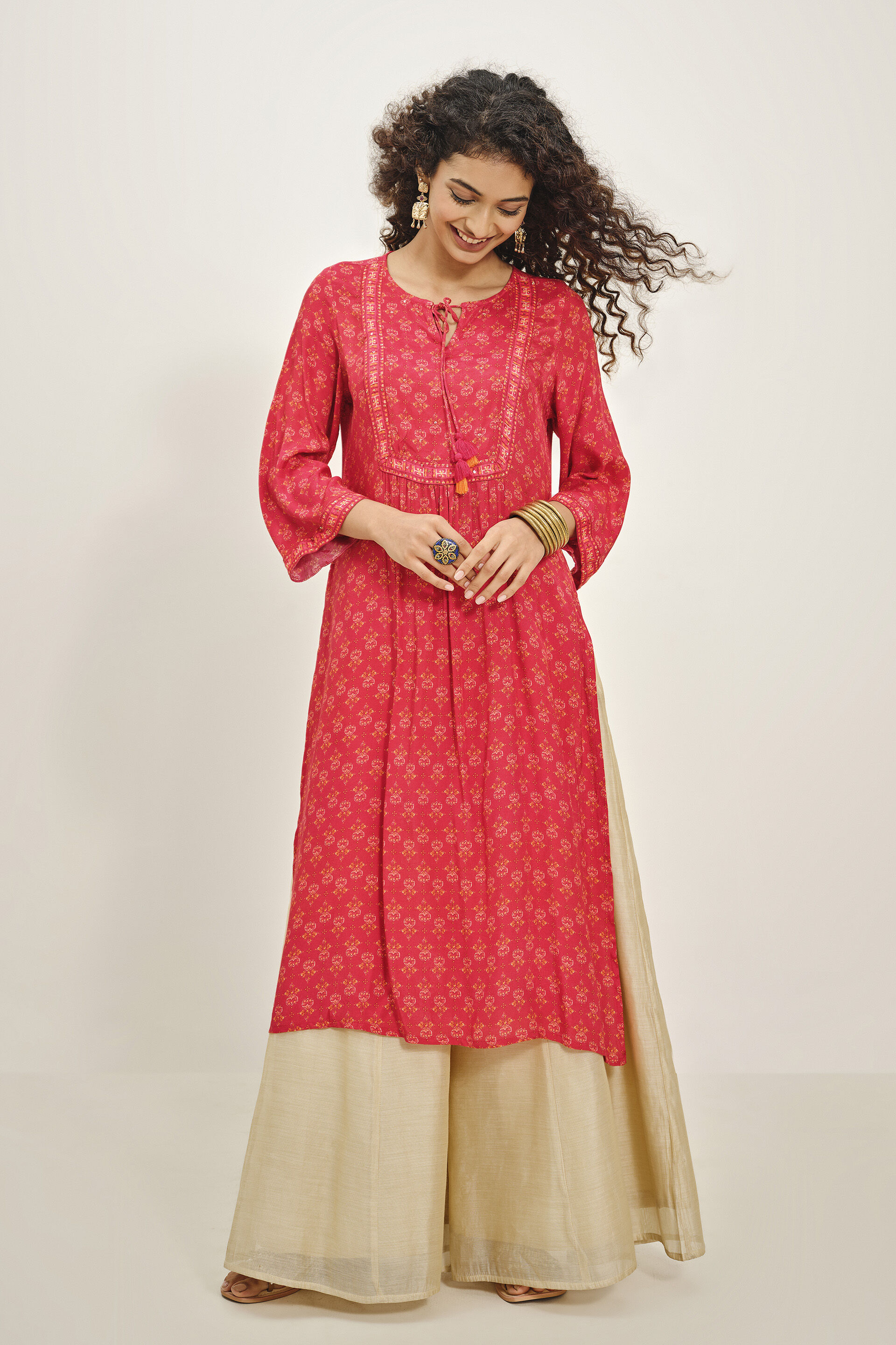 The Rangrez Red Kurta is designed in a straight silhouette with delicate embroidery, three-quarter sleeves, and a round neckline. A knee-length piece that’s perfect for adding festive flair to your evenings.