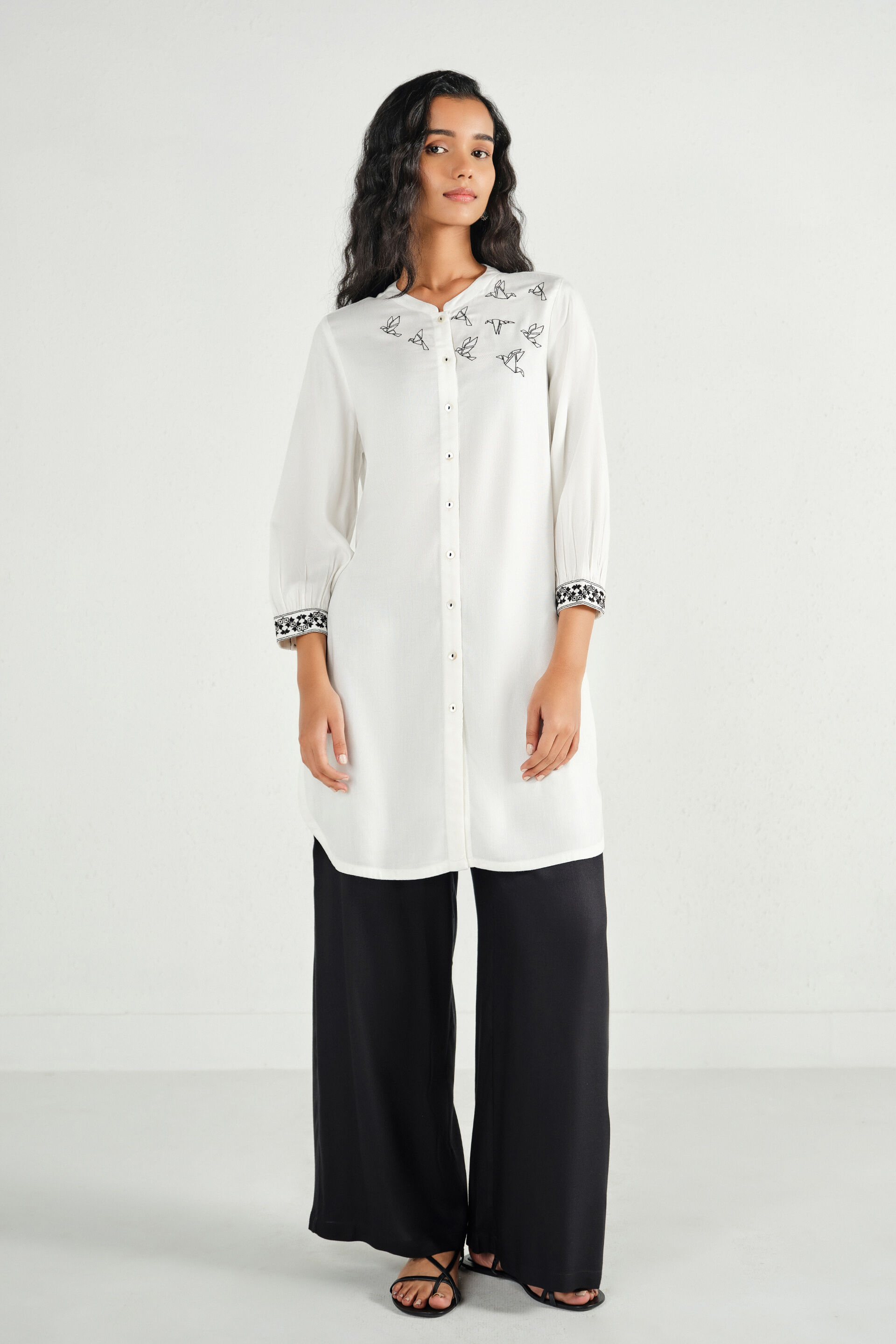 A white tunic featuring front embroidery, a band collar with button-up placket, three-quarter cuffed sleeves, and a straight mid-thigh silhouette.