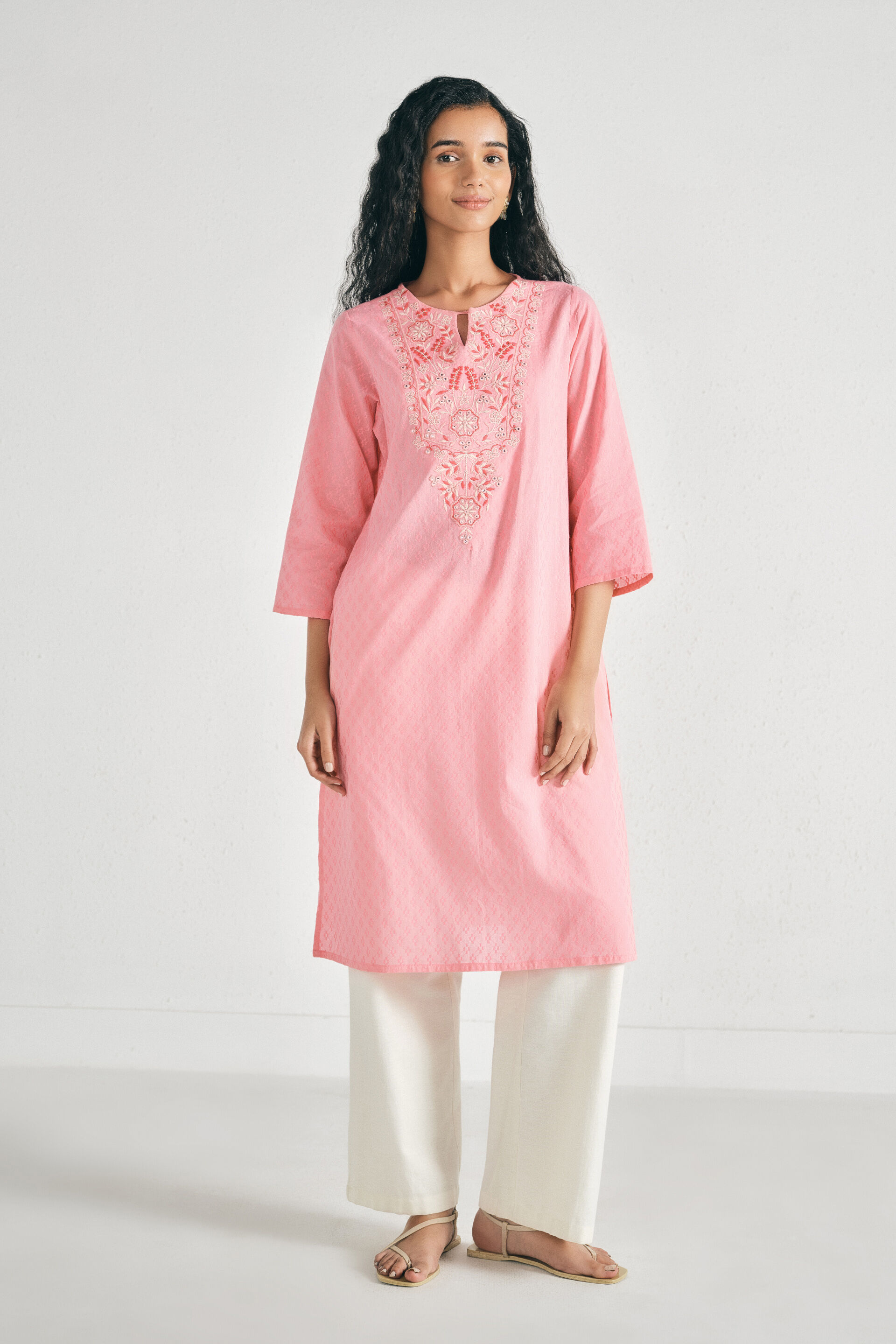 A pink cotton straight kurta designed with a round neckline and slit, three-quarter sleeves, mid-calf length, and a comfortable slip-in silhouette for daily wear.