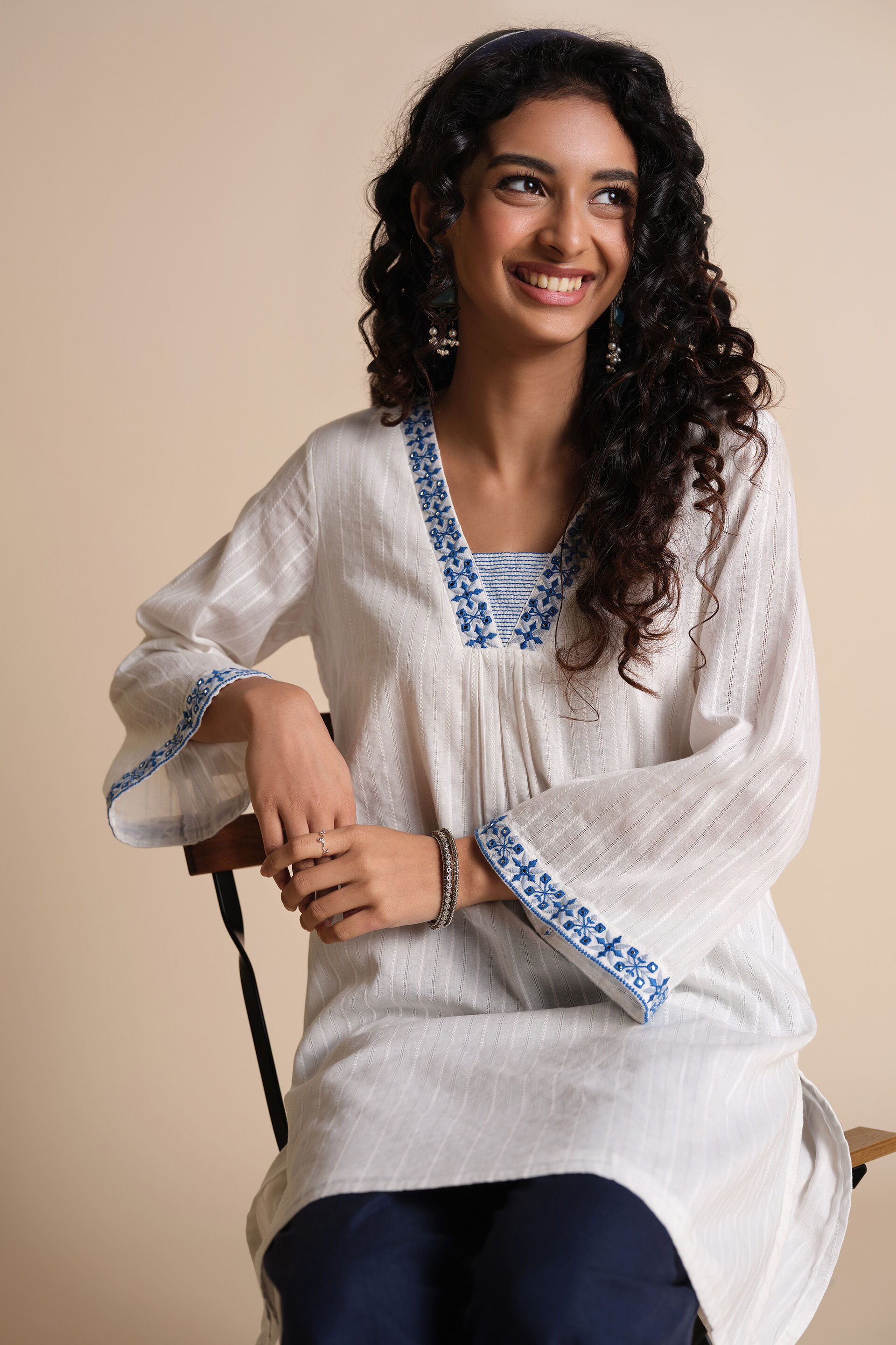 Step out in a cool & comfortable look with this soothing tunic. Crafted in breathable cotton, this tunic features India-inspired embroidery on its V-neckline & three-quarter bell sleeves. Pair it with complementing bottoms and pair your look with a satchel & sandals.