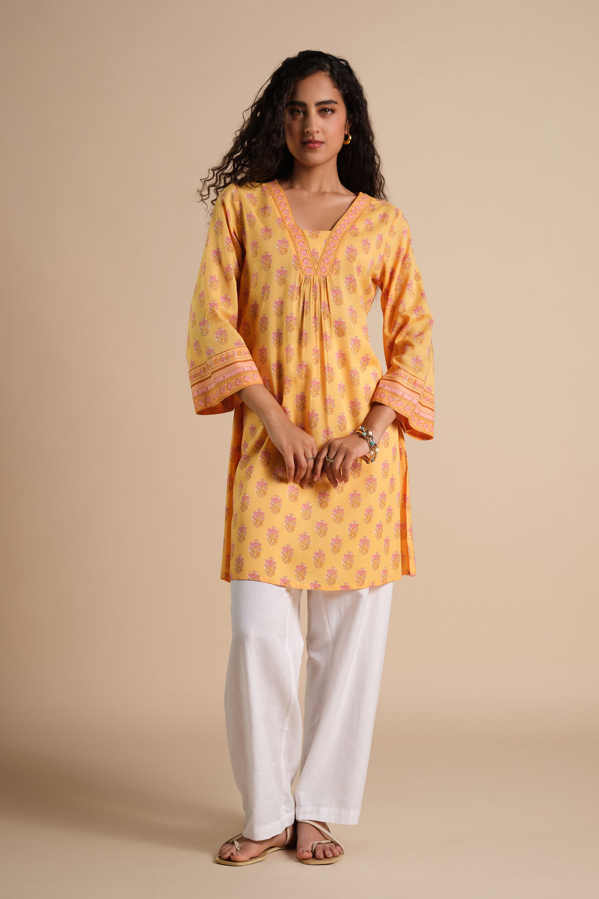 Shine bright in this mustard tunic, adorned with India-inspired prints all over. Featuring three-quarter bell sleeves & a V-neckline, this tunic comes with a border detailing on the collar & sleeves. Crafted from soft & flowy viscose fabric, you can pair this tunic with denim or linen pants to step out in style.