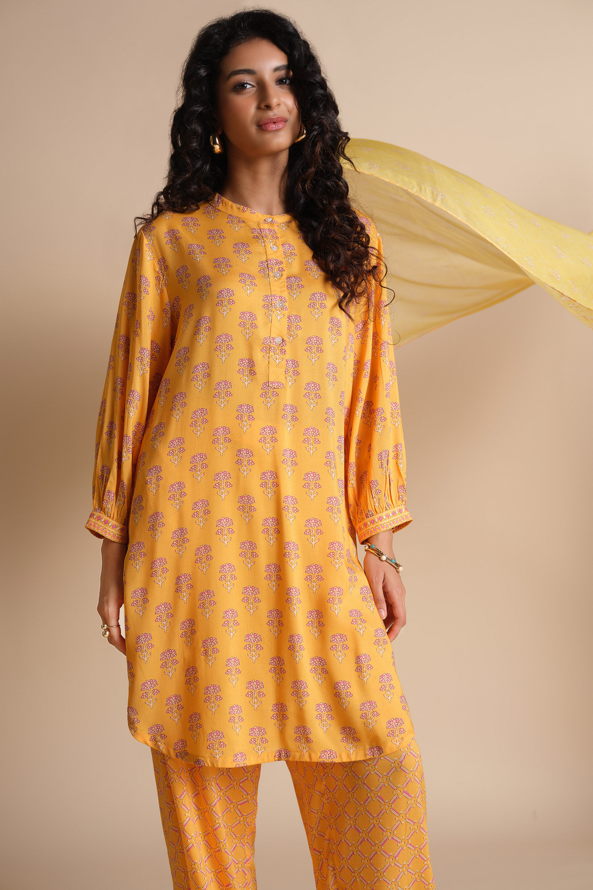 When you want to step out in summertime, choose this breezy & easy-to-wear tunic. Crafted in modal, it comes with all-over India-inspired floral prints and a relaxed fit. Featuring three-quarter sleeves, you can pair this tunic with matching or contrasting flared pants to elevate your look.