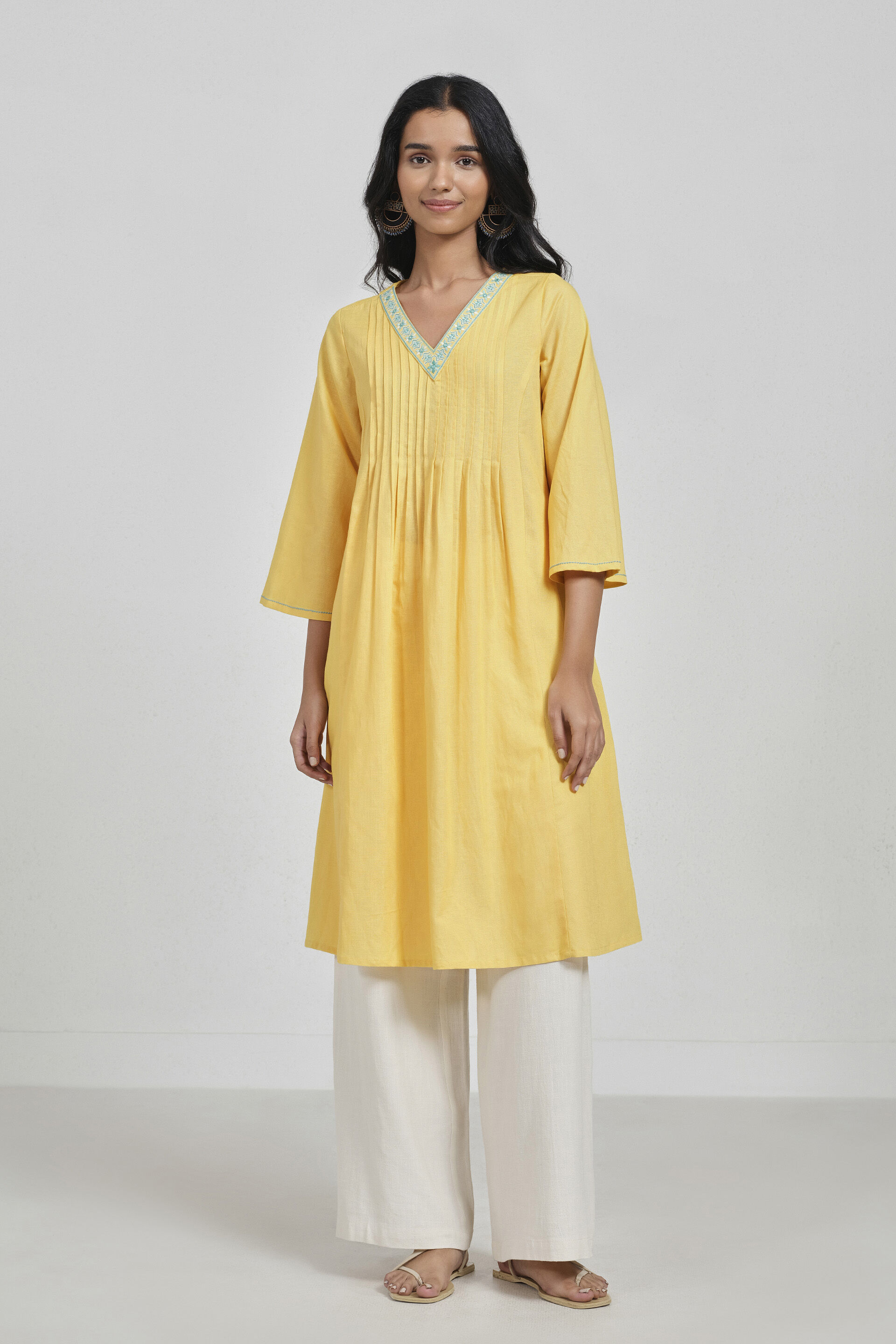A yellow A-line kurta designed with a V-neckline, three-quarter sleeves, mid-calf length, and soft pleats that enhance its fluid silhouette.