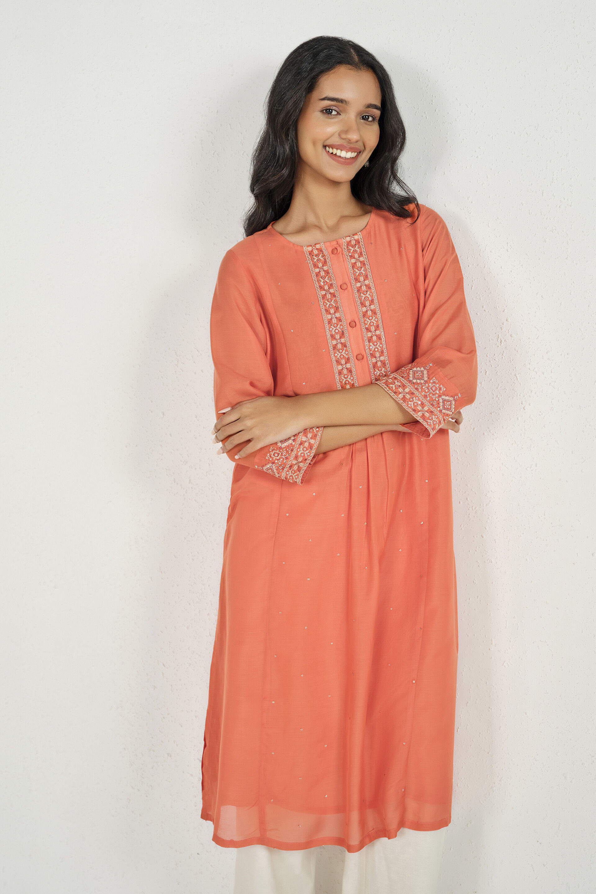 An orange A-line kurta featuring three-quarter sleeves and a round neckline with front placket. Designed in a mid-calf length silhouette with embroidery.