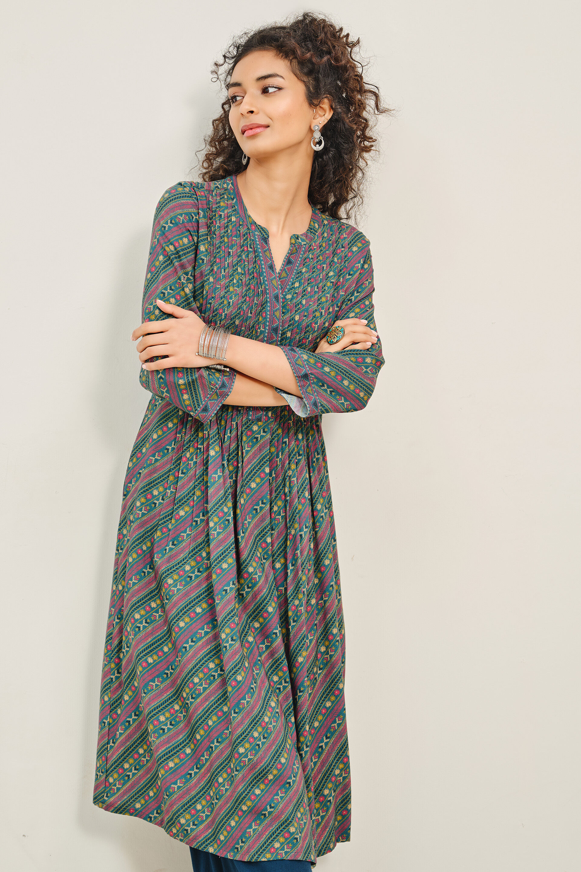 The Teal Tamanna Kurta is designed in soft cotton with a refreshing print. A band neckline, A-line cut, and three-quarter sleeves make it an easy pick for everyday wear with palazzos, skirts, or slim pants.