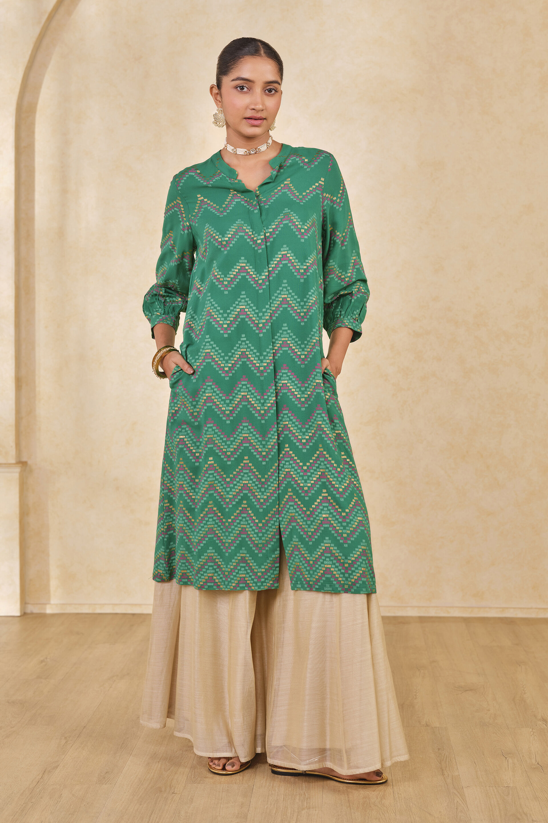Step into effortless style with a twist of fun and flair! This classic green kurta features a chevron print on a soft eco-friendly viscose fabric blend, ensuring both comfort and style. The front-open kurta is perfect for your traditional look.