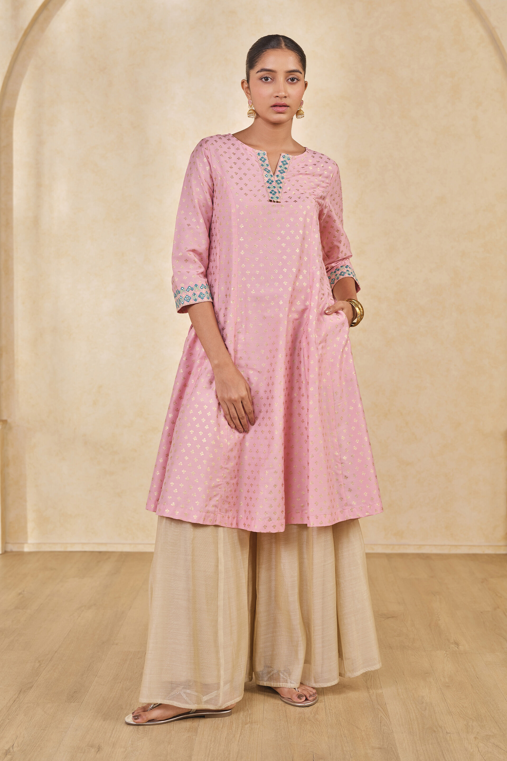 Lift your style with a floral touch! This classic kurta showcases a stunning floral gold print on a soft eco-friendly viscose blend fabric which keeps you comfortable all day long. Designed for both style and functionality, it features convenient side pockets.