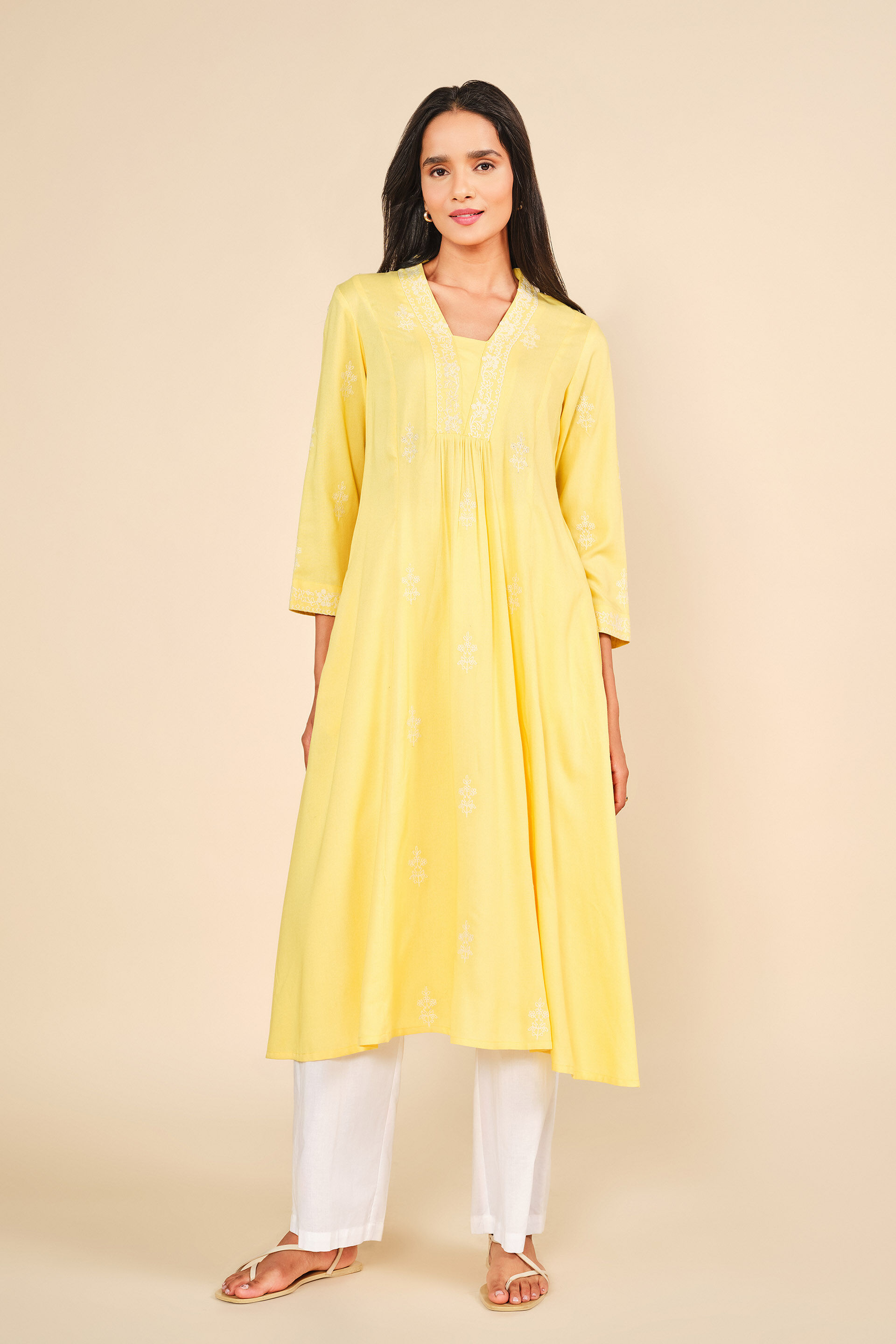 Twirl into tradition with a twist in this vibrant yellow kurta! Featuring India-inspired prints and embroidery on viscose fabric that’s lightweight and breathable. It comes in an A-line silhouette featuring gathers and three-quarter sleeves while beautifully balancing classic style with modern ease.