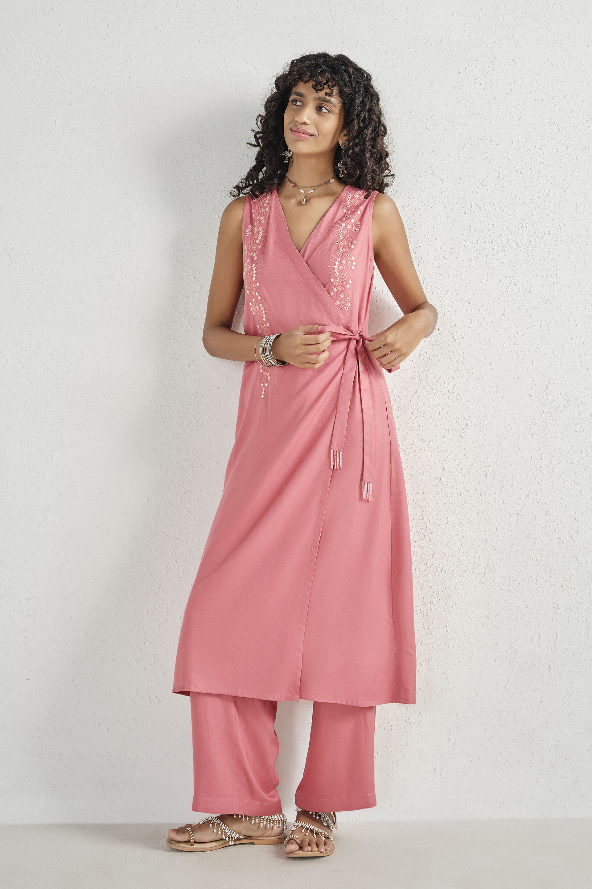 A two piece set that comes with a sleeveless pink embroidered overlap kurta featuring a V-neckline and straight silhouette, paired with straight full-length pants detailed with two pockets.