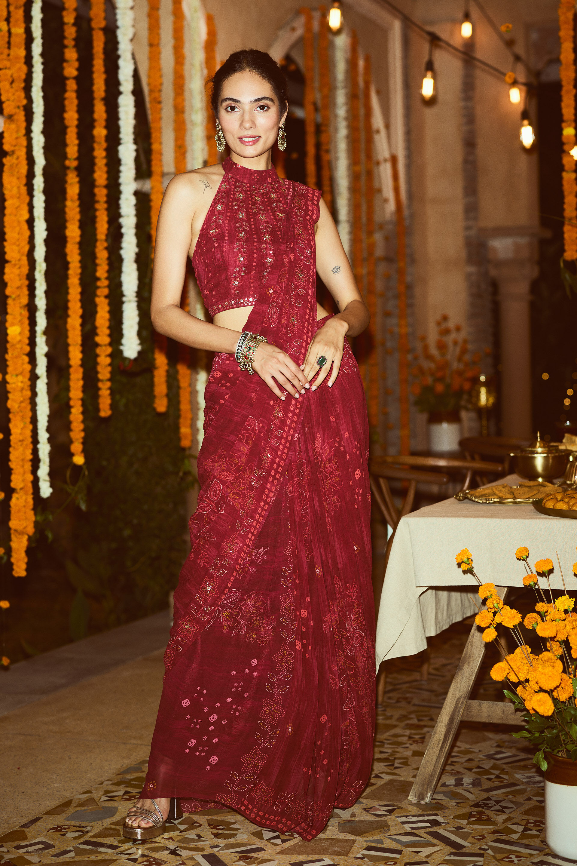 A modern twist on tradition, this stitched saree comes in a bold red hue with a zip closure for effortless wear. Paired with a halter-style embroidered blouse, it’s designed to turn heads at every celebration.