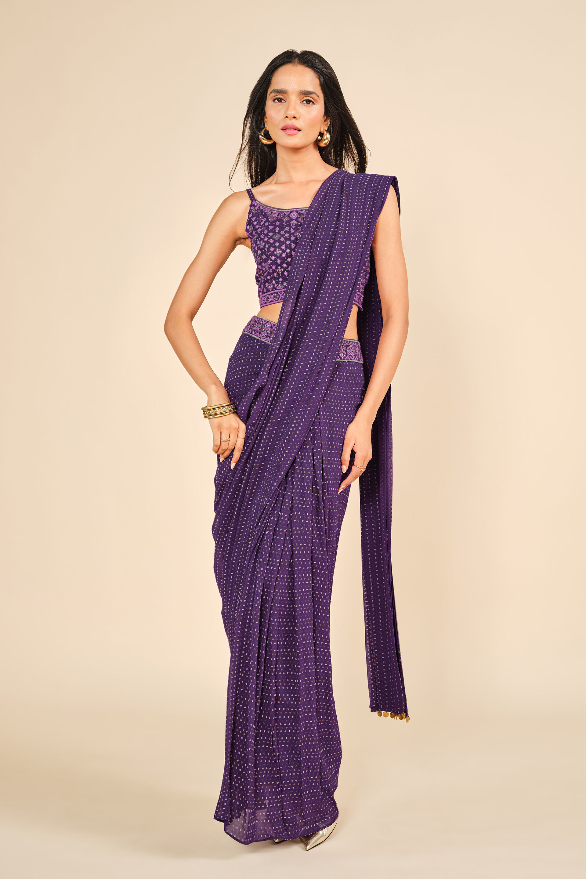 Dance to your favourite song in this stunning pre-stitched saree that comes with a beautifully mirror embroidered choli, making it the perfect blend of elegance and tradition.
