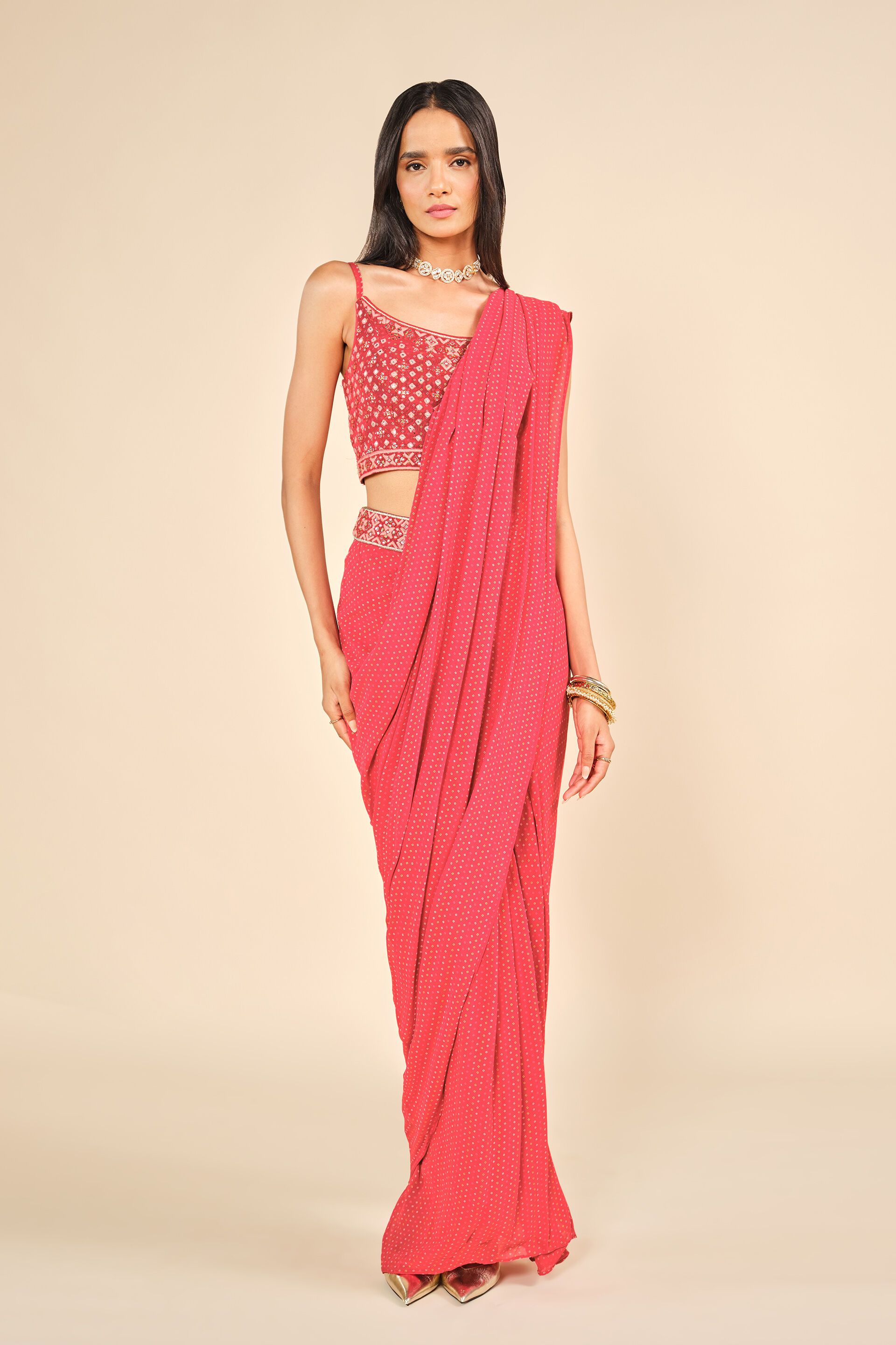 Dance to your favourite song in this stunning pre-stitched saree that comes with a beautifully mirror embroidered choli, making it the perfect blend of elegance and tradition.