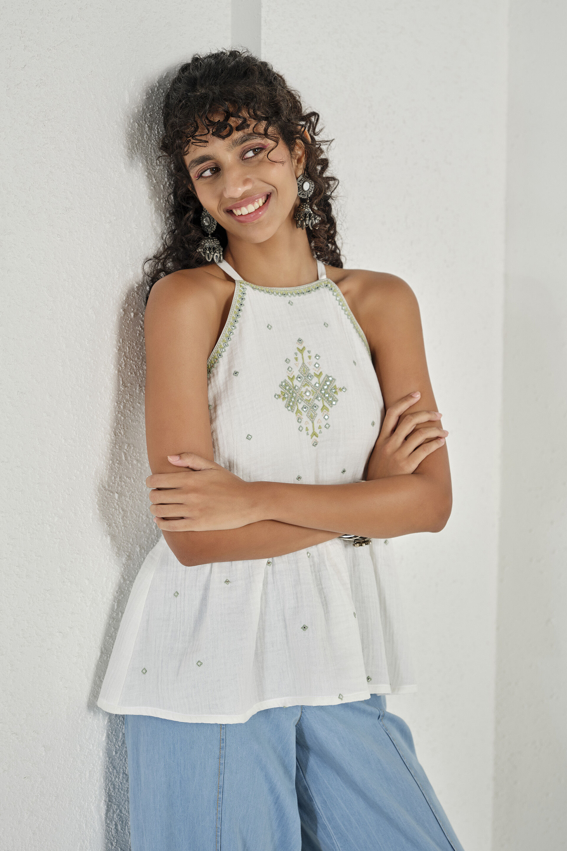 An off-white embroidered in-cut swing top featuring a round neckline, strappy silhouette, hip-length hem, A-line shape, and back slit with button detail.