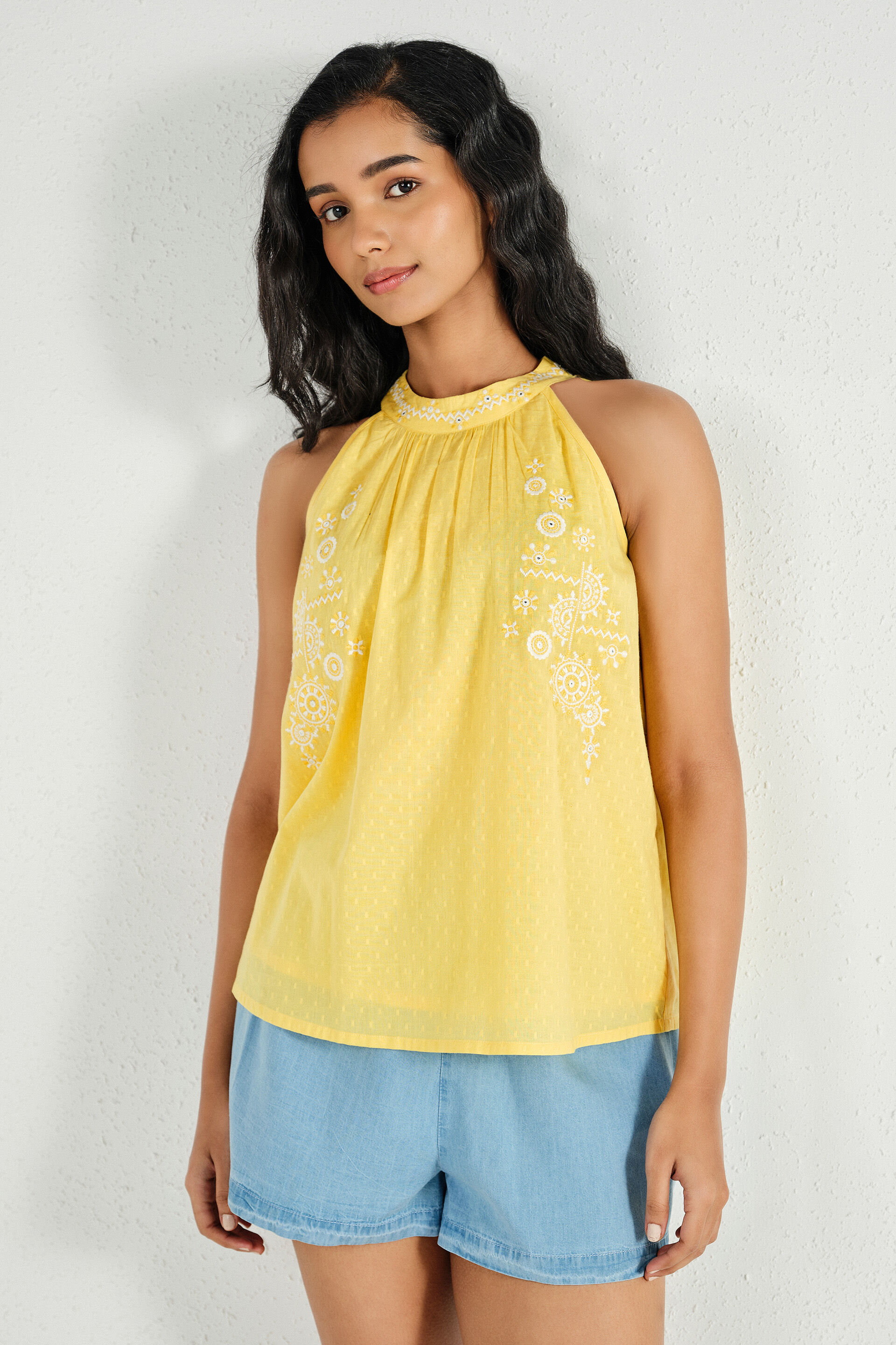 A yellow cotton halter top in cotton featuring a band collar with back tie detail, hip-length silhouette and in-cut halter sleeves.