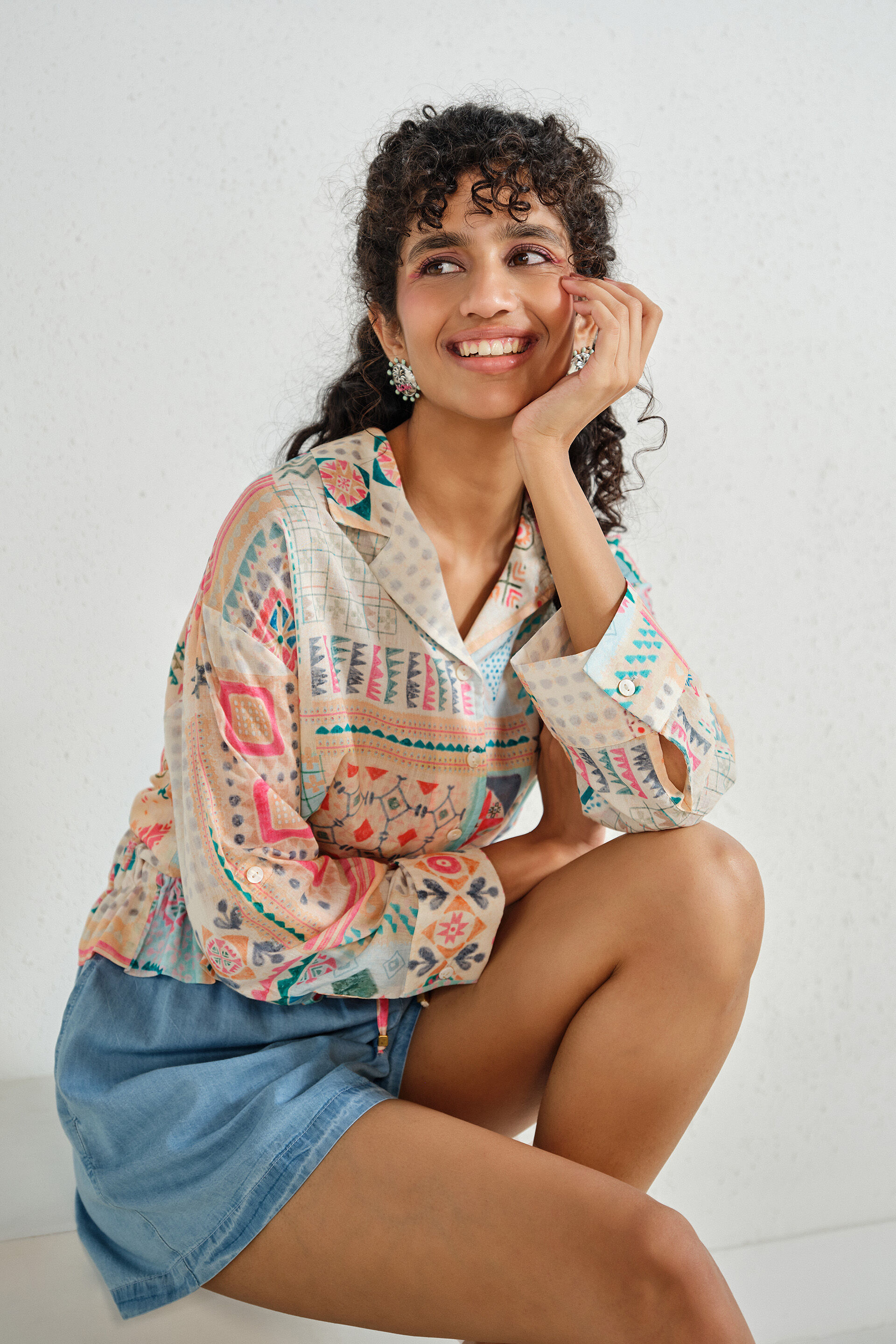 An off-white printed boxy shirt featuring a collared neckline, rolled cuffs, hip-length hem, and front button-up closure.