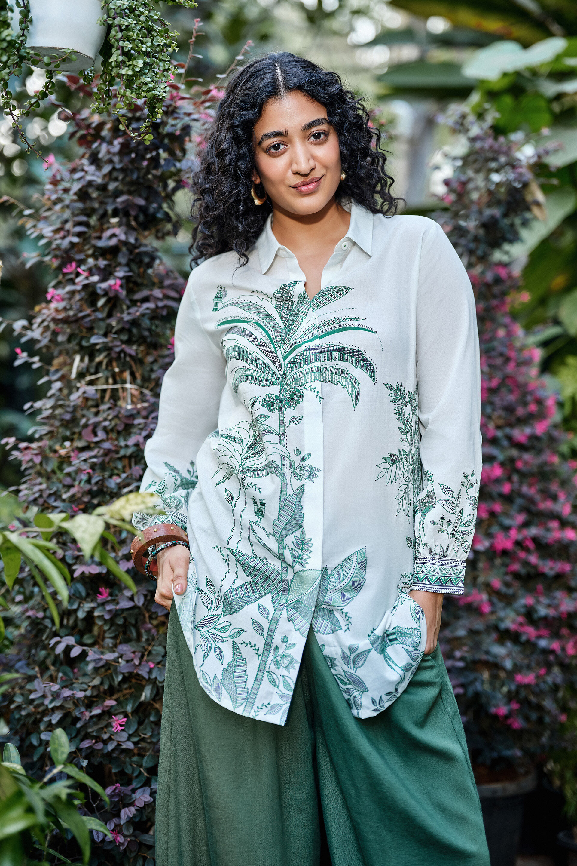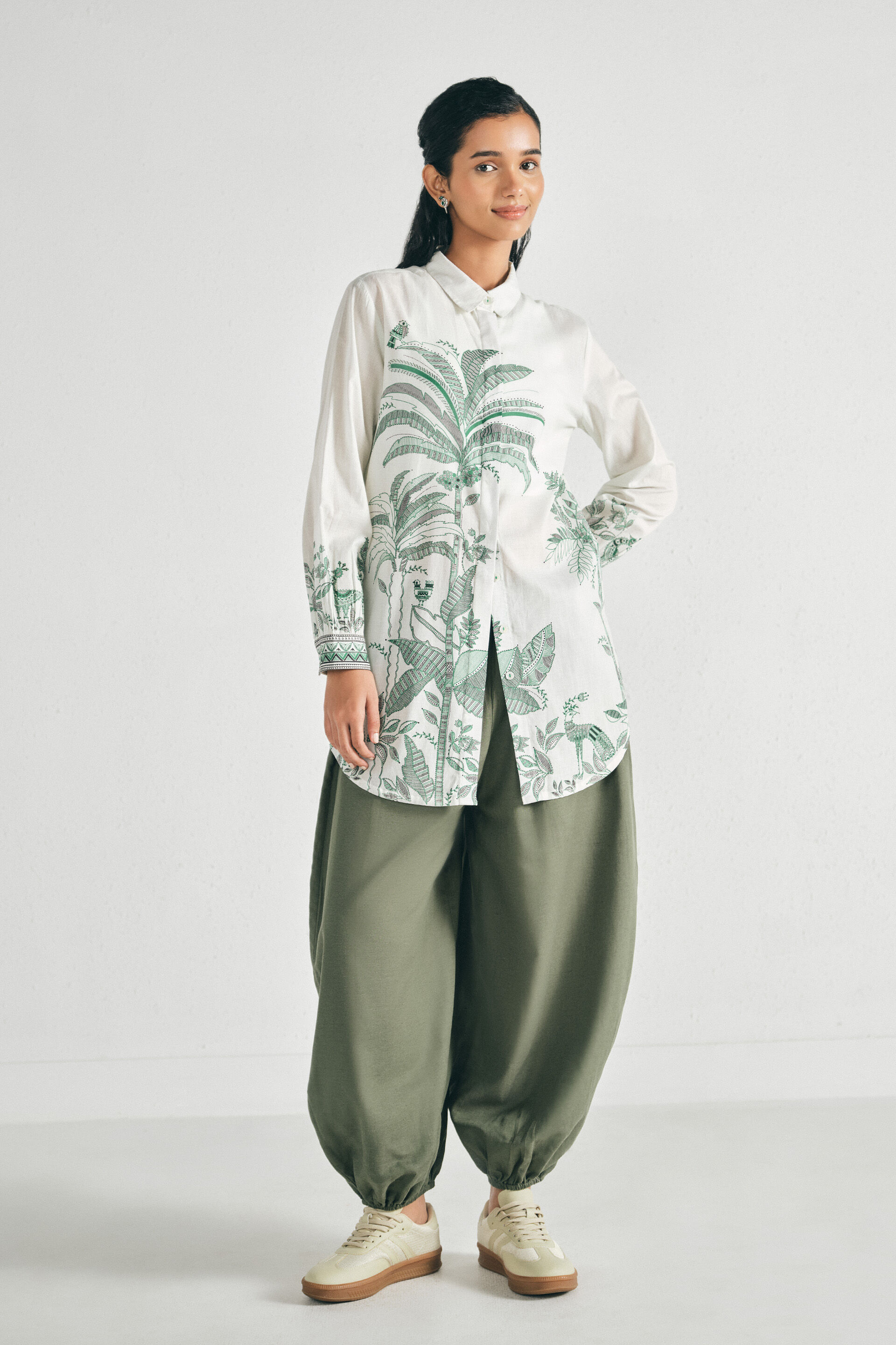 An off-white mul cotton shirt tunic designed with a collared neckline, front button-up closure, three-quarter cuffed sleeves, rounded hem, mid-thigh length, and placement print.