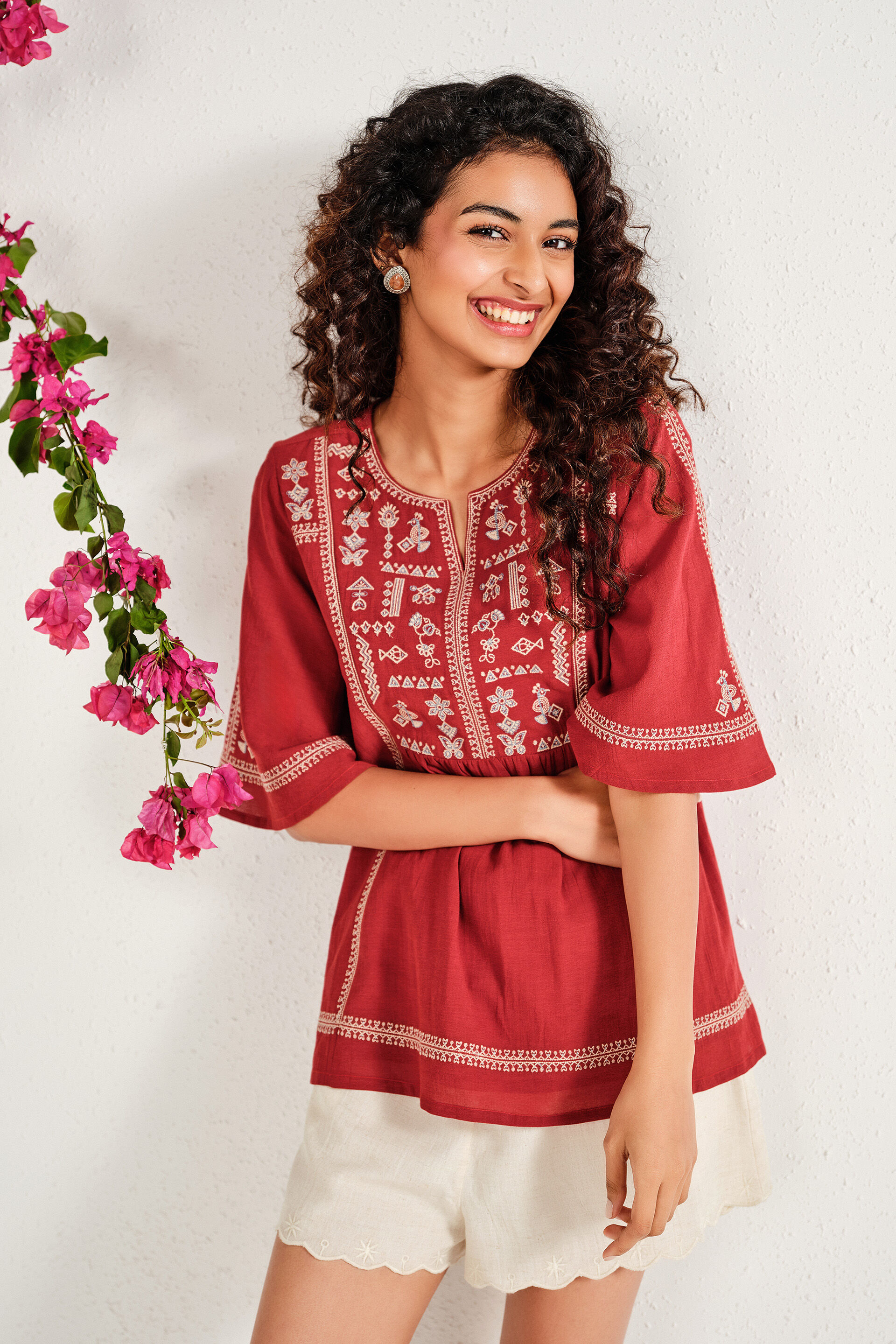 A rust cotton-blend boxy top designed with a gathered yoke, elbow-length trumpet sleeves, and a round neckline with slit for easy everyday wear.