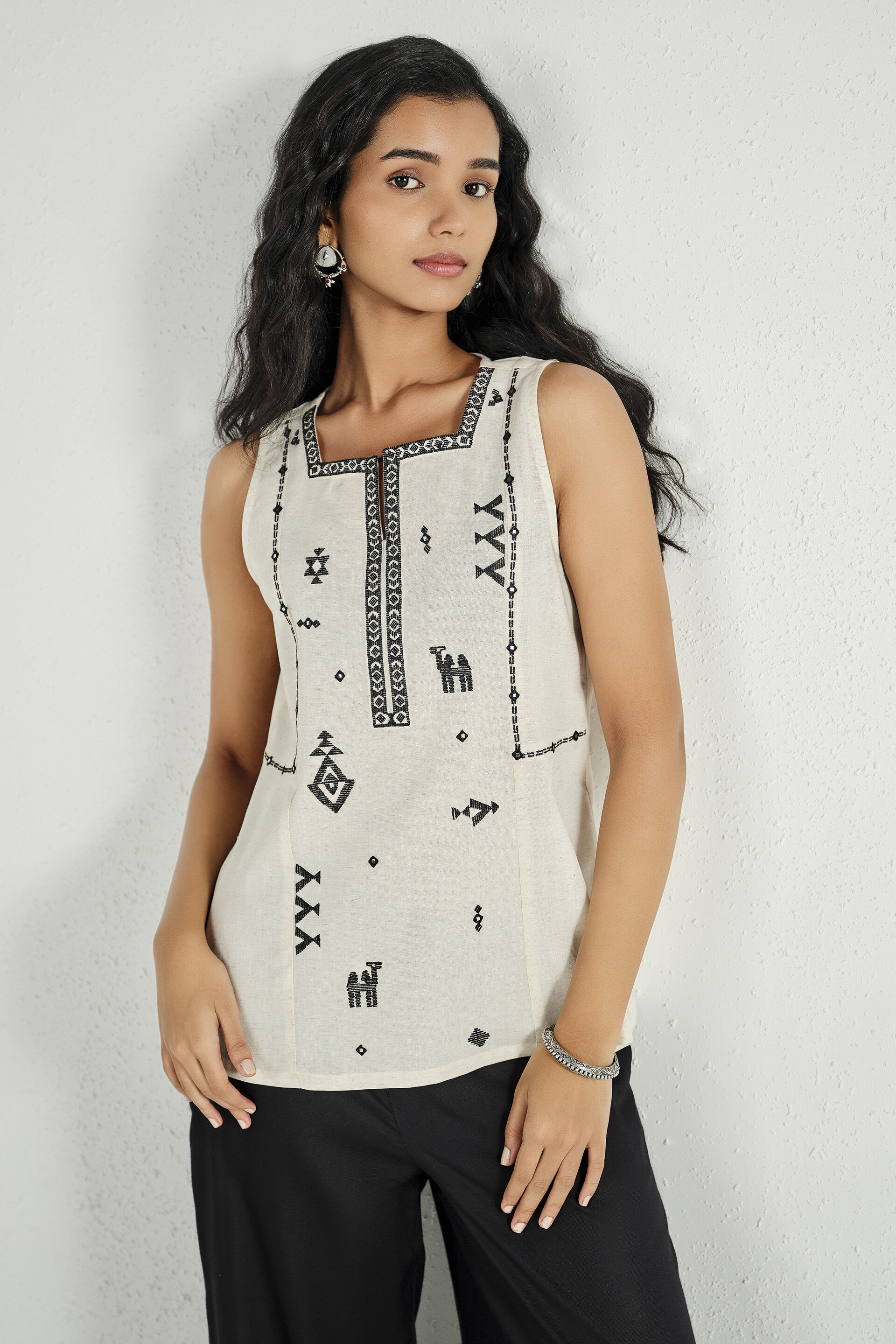 A cream sleeveless top in a linen-blend, featuring a square neckline, front placket, straight fit, and delicate embroidery.