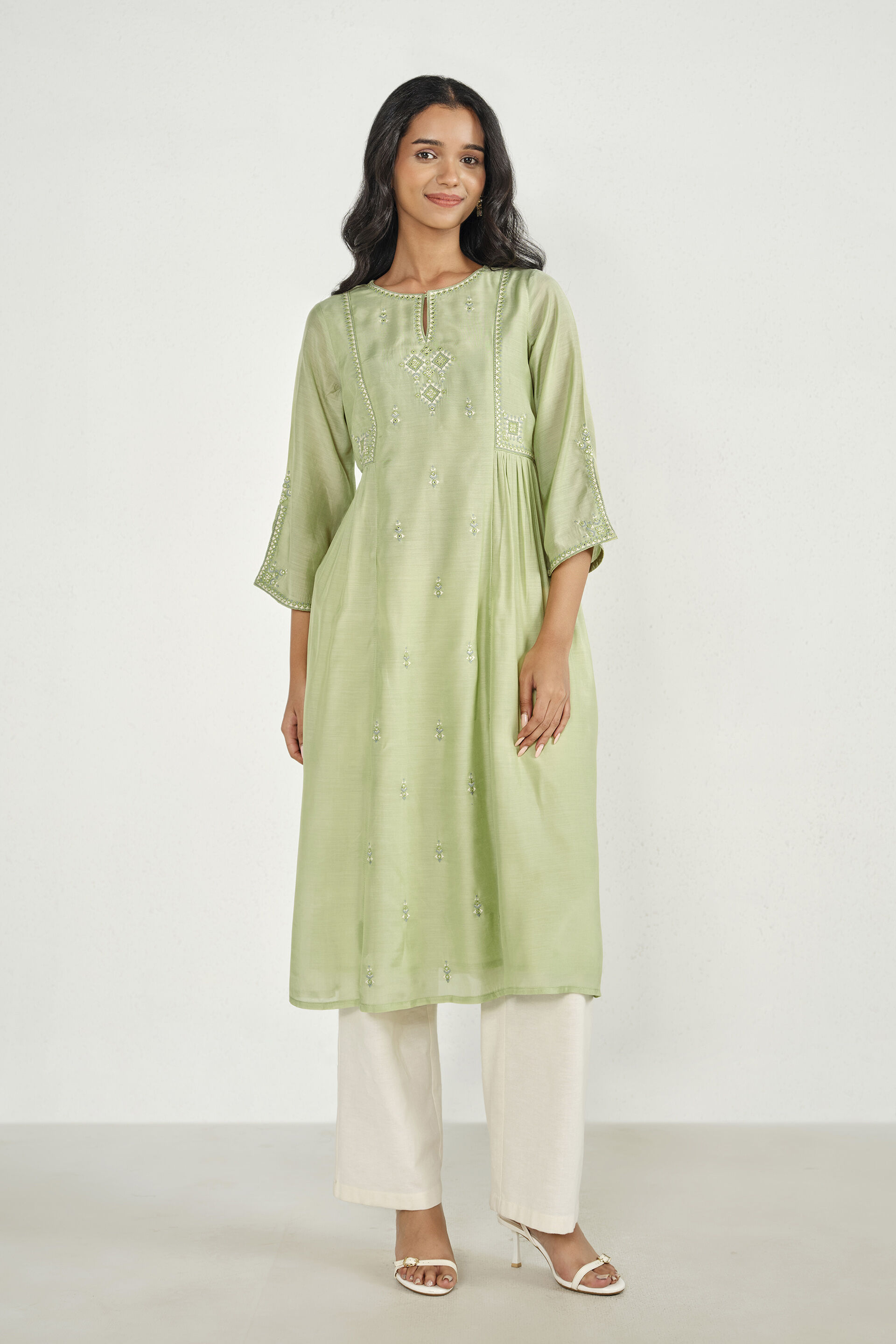 A sage embroidered A-line kurta featuring three-quarter sleeves and a round neckline with slit. Designed in a below-knee length silhouette.