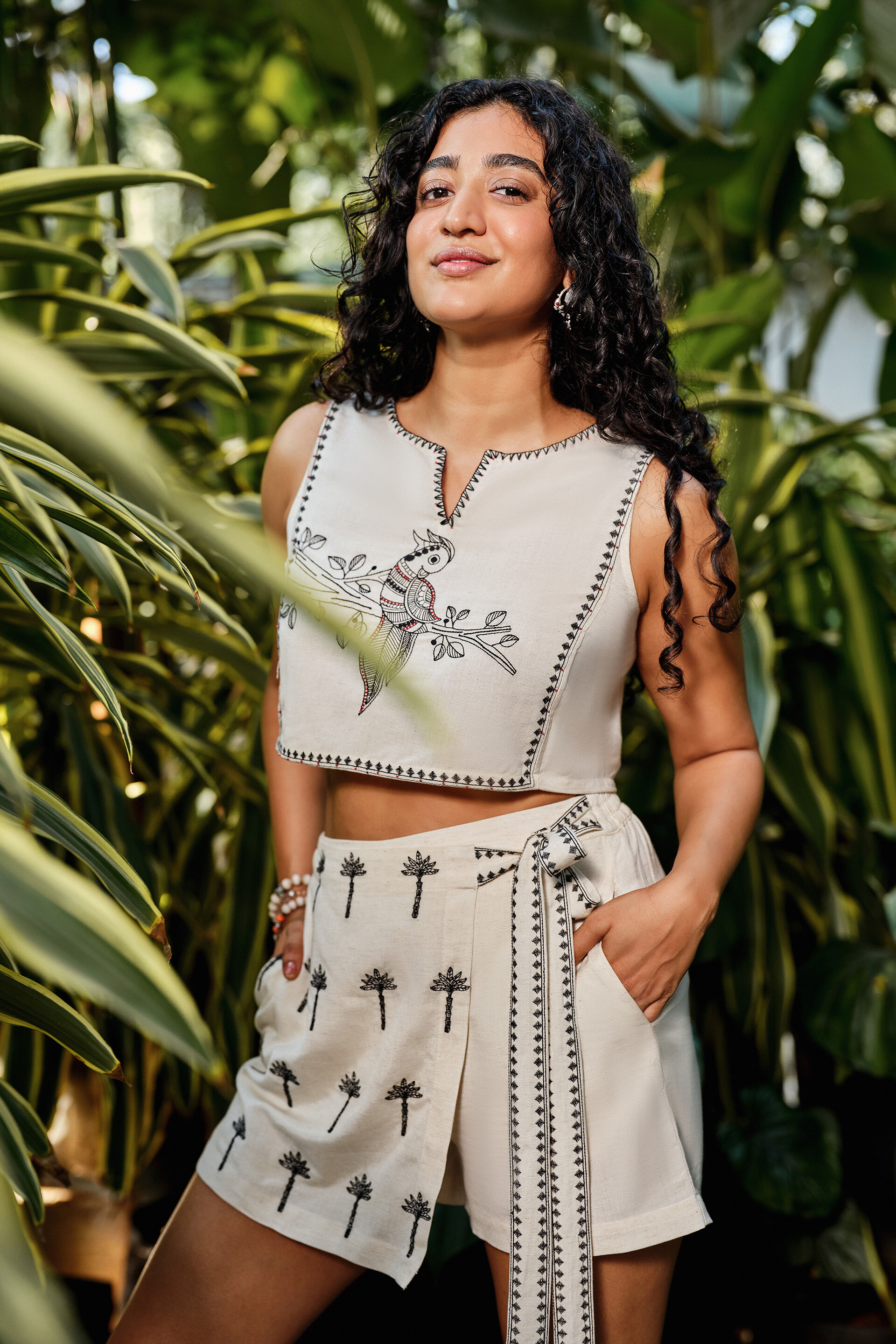 A two piece set that comes with a sleeveless embroidered crop top featuring a round neckline with slit and boxy fit, paired with a wrap skort secured with a side zipper.