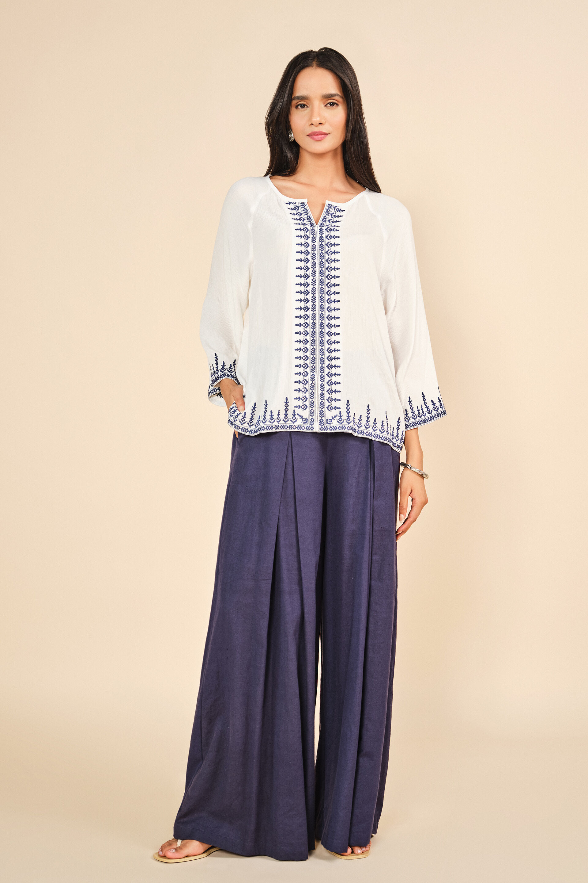 Look cool & comfortable in our soothing Blue Boond Top. Crafted in soft eco-friendly viscose fabric, this top features India-inspired prints with mirror & thread embroidery on the front & its full sleeves. The small collar with loop buttons add a touch of elegance to the design. You can pair this top with flared bottoms or denim and style your look with a satchel & sandals for a day of exploration.