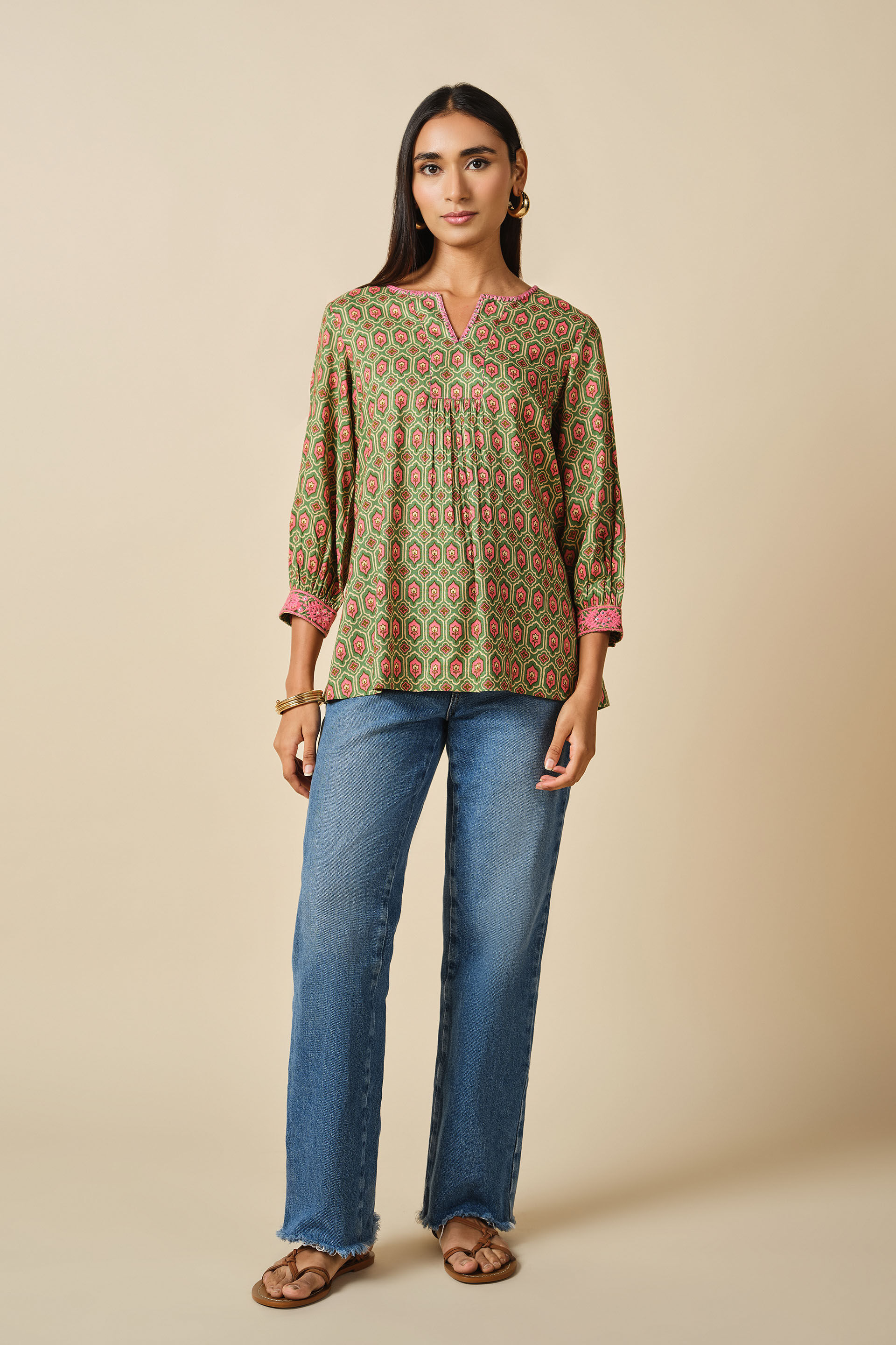 This easy to slip into top is perfect for summers. Featuring India-inspired prints, this top is crafted in flowy viscose and comes in a fit-and-flare silhouette. Featuring three-quarter sleeves with embroidery details, this breezy top comes with a round neckline. Pair it with white pants & metallic sliders to look holiday ready.