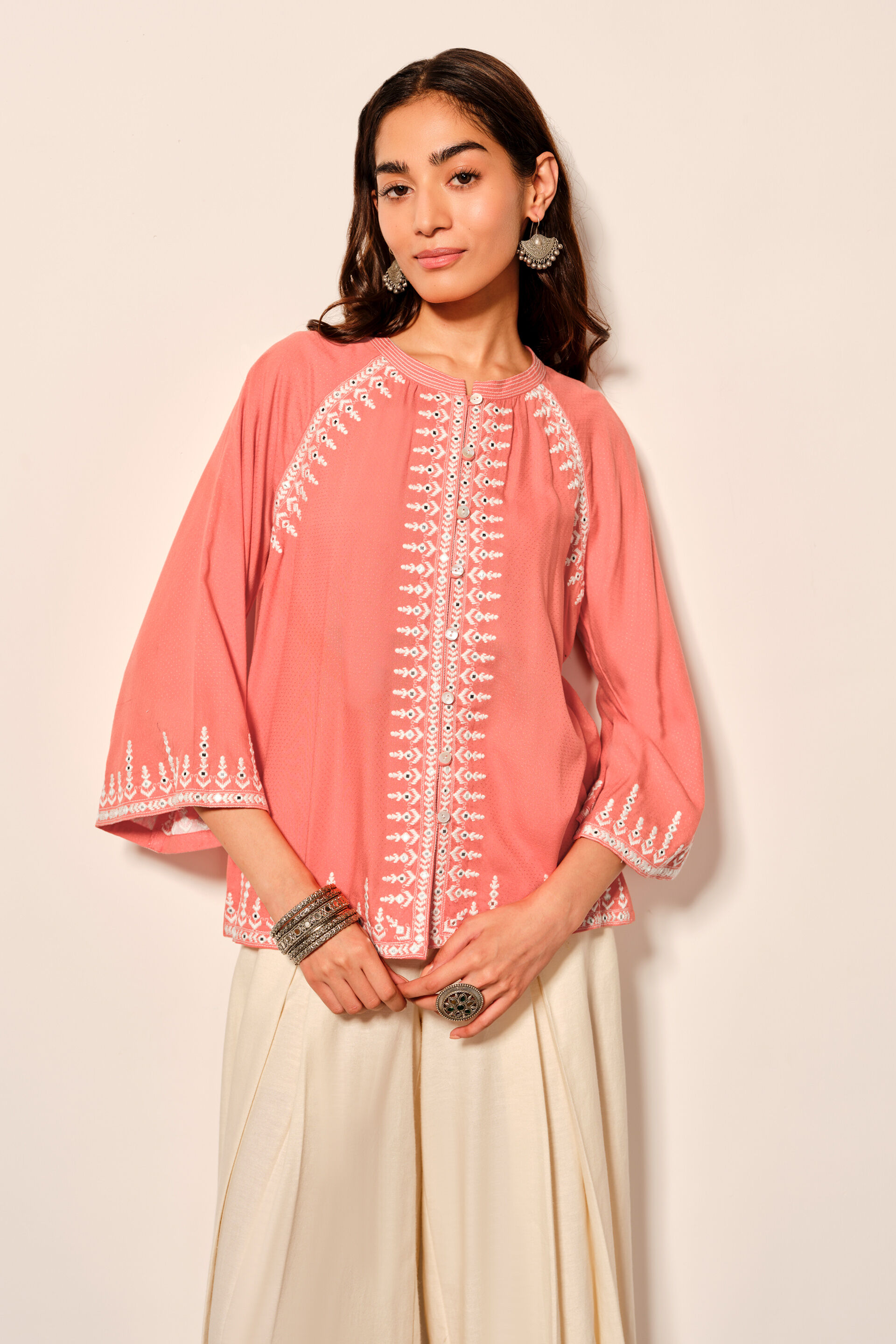 This coral front open top is crafted from rayon dobby fabric and features intricate mirror and thread work embroidery on the front and sleeves. The small collar with loop buttons adds a touch of elegance to the design. Ideal for casual outings, day events, and informal gatherings, this top pairs beautifully with white pants for a stylish look.