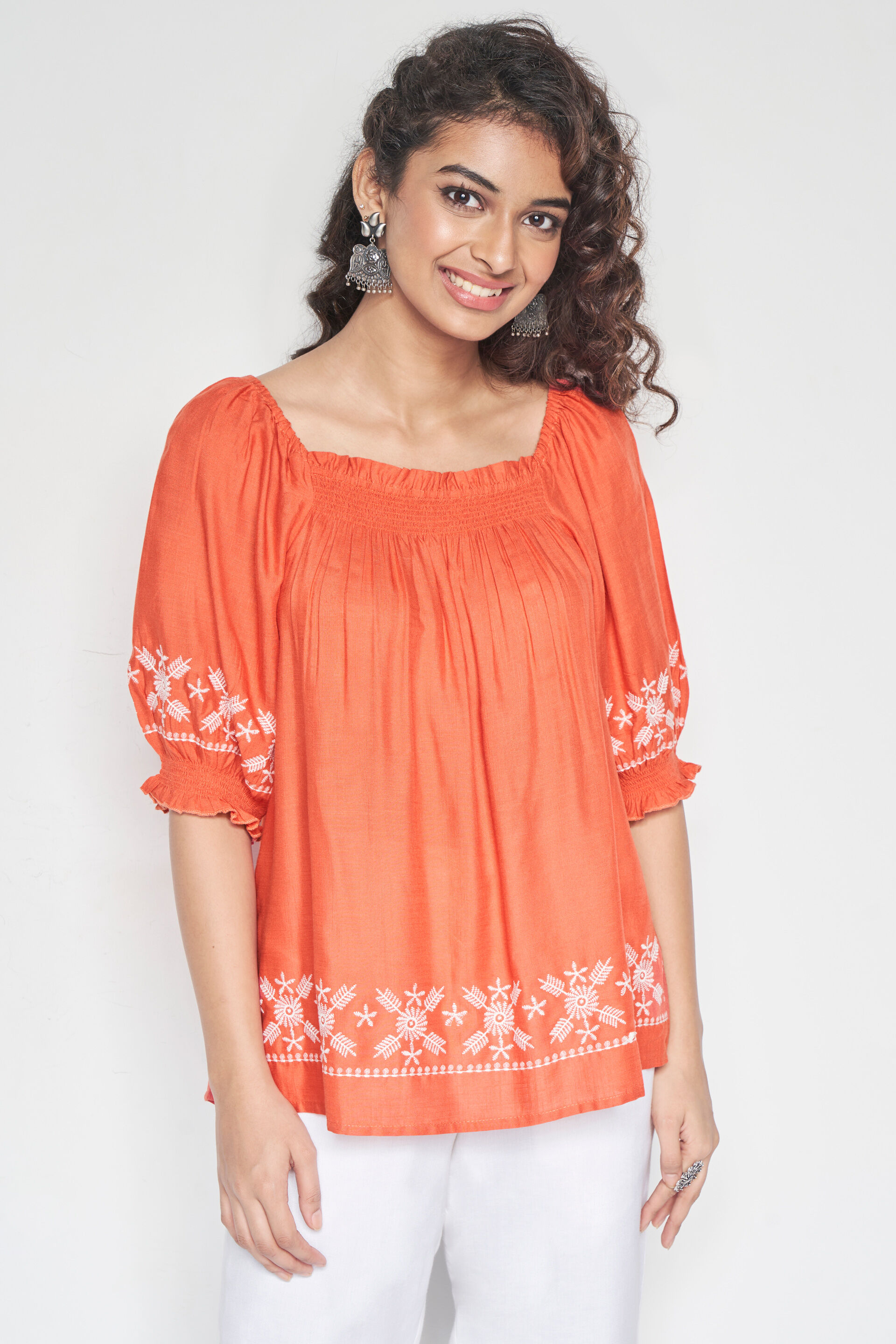 Perfect for a casual lunch, this bright top comes with delicate embroidery. Both the sleeve and neckline are elasticated.