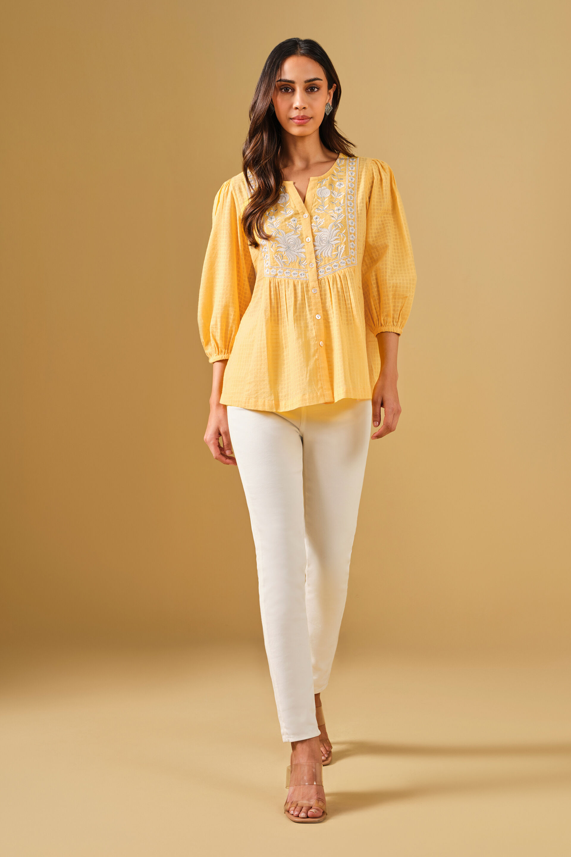 Bring the sunshine to your closet with this bright yellow top. Featuring delicate floral embroidery on the front with puff sleeves and buttons, this top is crafted using 100% biodegradable Viscose.