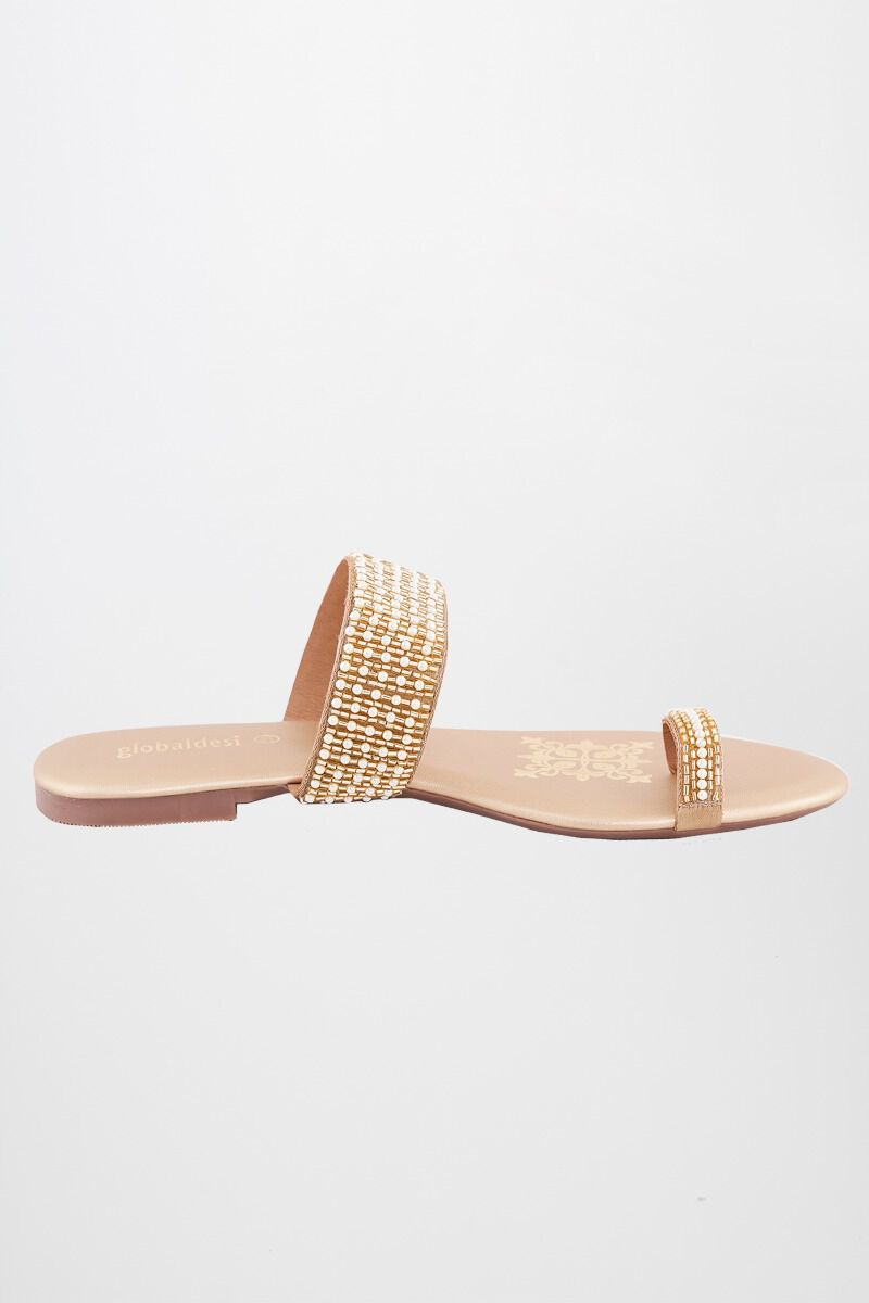 A pair of flats for your festive occasions are these elegant toe-loop footwear for women from Global Desi. Adorned with pearl embellishment appearing in horizontal stripes in gold with the most comfortable sole. Stylise these with any ethnic wear or even your modern trousers. Manufactured by -  Ochre & Black Private Limited, Plot No R 847/1/1, TTC Ind. Area, MIDC, Rabale, Navi Mumbai, India –400701. Country of origin: India