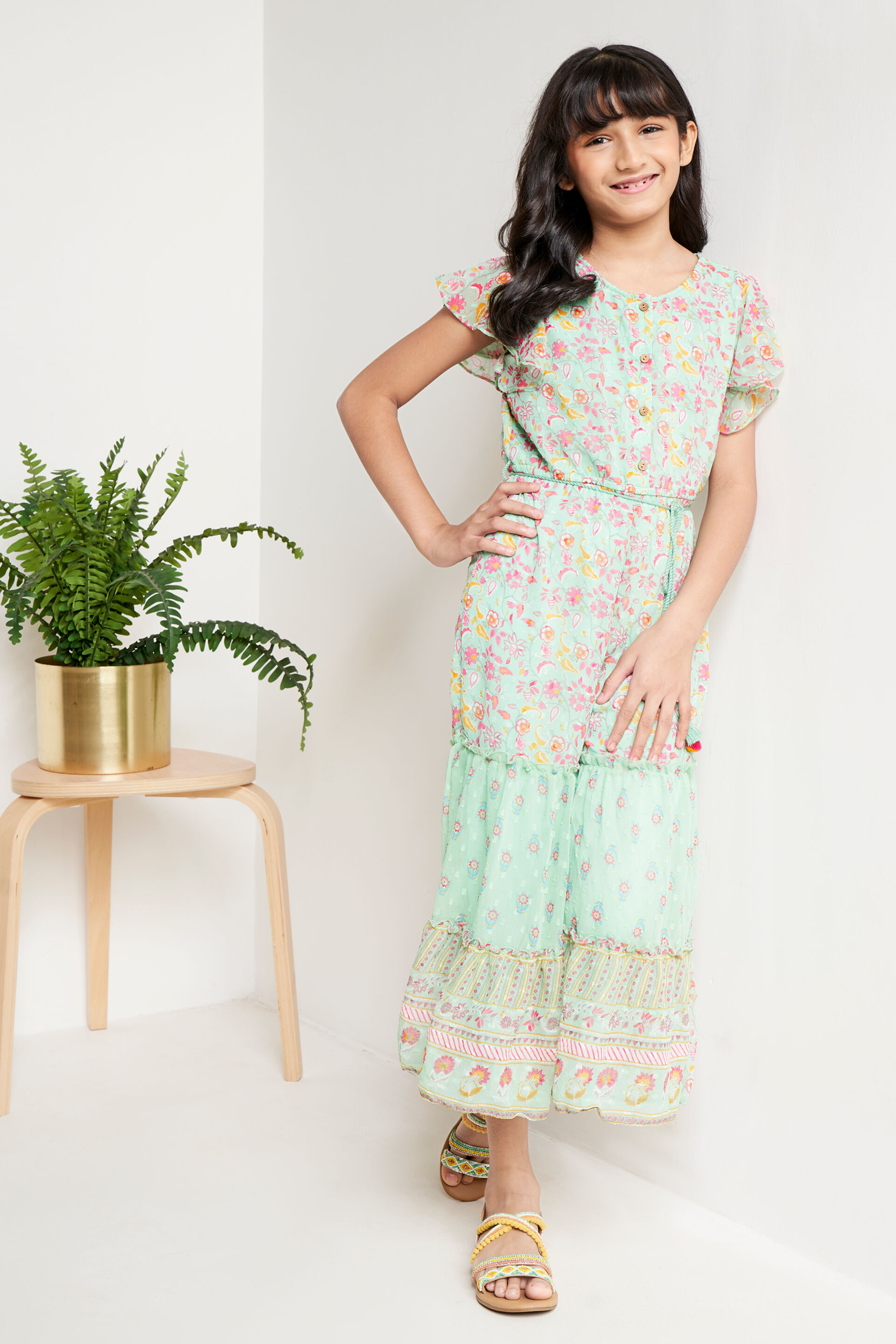 Get your darling daughter party-ready this season with this gorgeous printed jumpsuit for girls from Global Desi. Beautified with floral motif iterations, this jumpsuit is crafted from breathable fabric with frilled short flared sleeves and tiered frilled three-fourth flared bottoms. The drawstring dori at the waistline is to give the contour a better-fitted look. Stylise this jumpsuit with ethnic gold earrings and juttis.