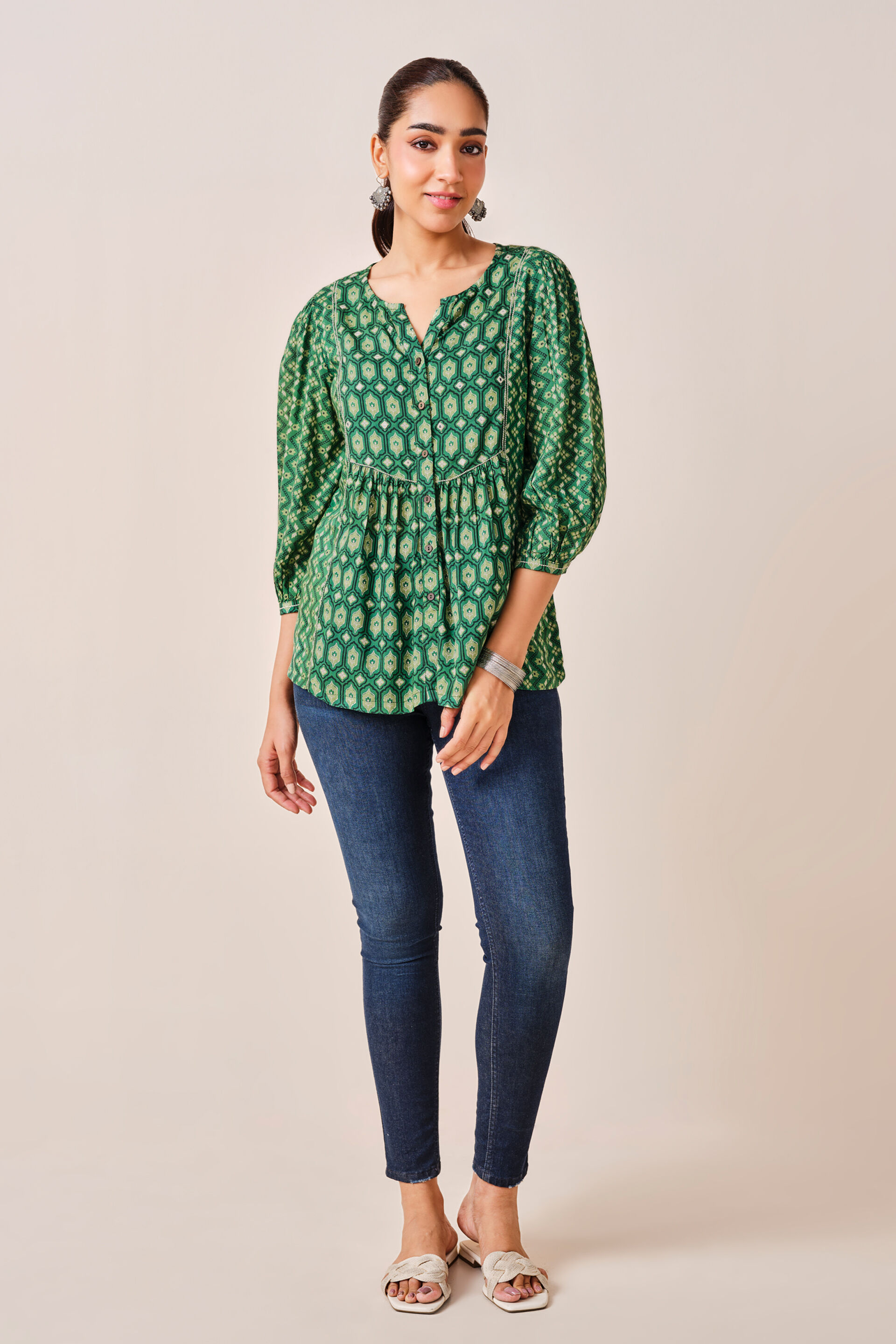 Crafted with 100% viscose, this top is a great pick for a hot day. Featuring a mix of two floral prints with light embroidery all over, it makes for a great weekend 'fit when paired with denims.