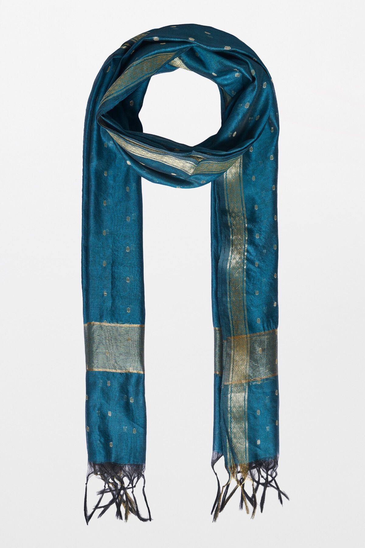 This sophisticated and elegant stole complements your festive kurtas from Global Desi. Crafted from the woven banarasi-like material in gold and teal blue. Throw it over any kurtas or even a solid top and wear it as a statement piece. Stylise the stole with gold jhumkas and bangles. Manufactured by - Ochre and Black Private Limited, Plot No R 847/1/1, TTC Ind. Area, MIDC, Rabale, Navi Mumbai, India –400701 Country of origin: India
