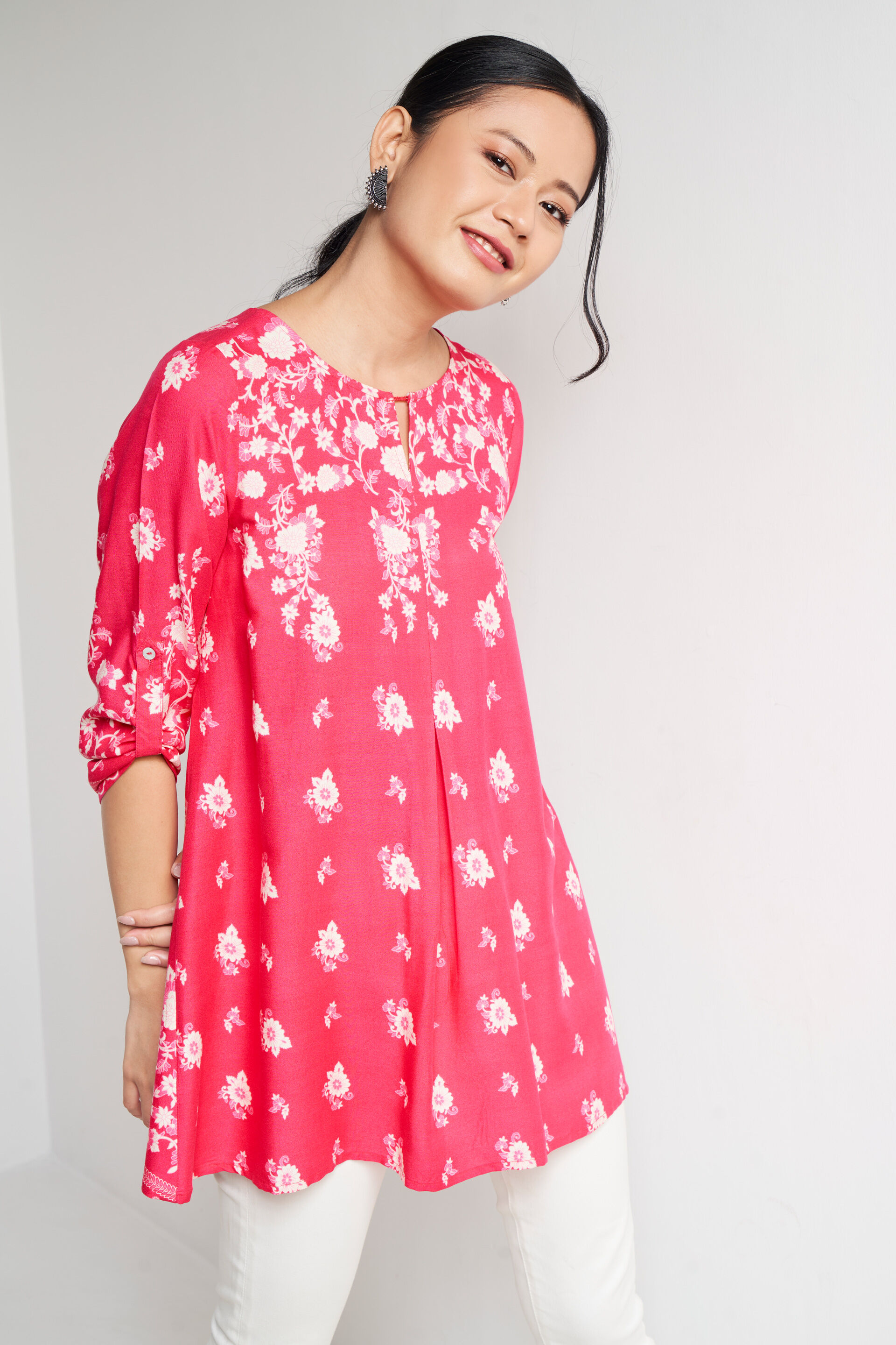 Perfect for laid-back weekends to run errands is this comfortable and elegant top for women from Global Desi. In an eye-catching shade of hot pink with floral print all over, this top features a round neck, buttoned bodice and buttoned three-fourth sleeves. Pair this top with jeans or trousers of any shade along with dainty stylish earrings.
