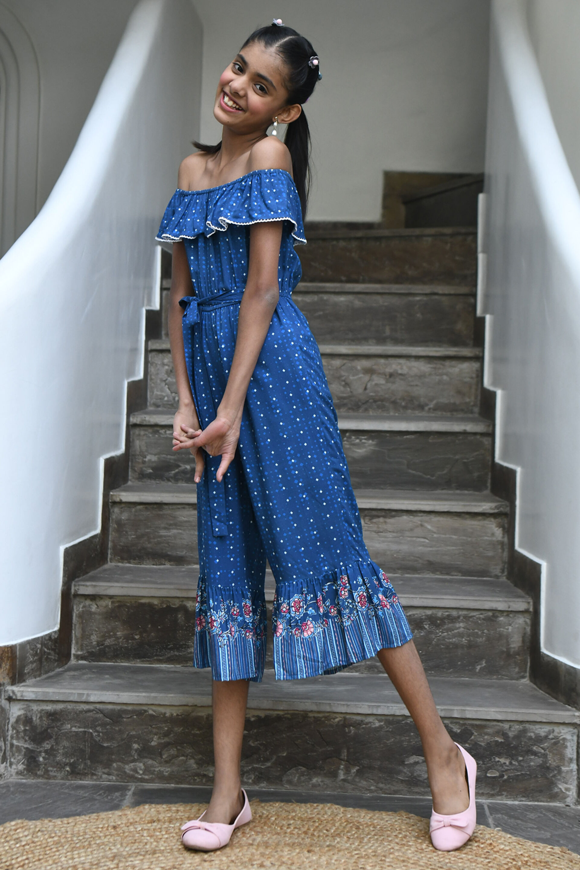 Upgrade your sweet girl’s wardrobe with this super chic indigo bordac jumpsuit. It flaunts a frilled neckline and a flared bottom hemline with floral print. Just throw in a cute headband and some festive sandals to finish off the look.