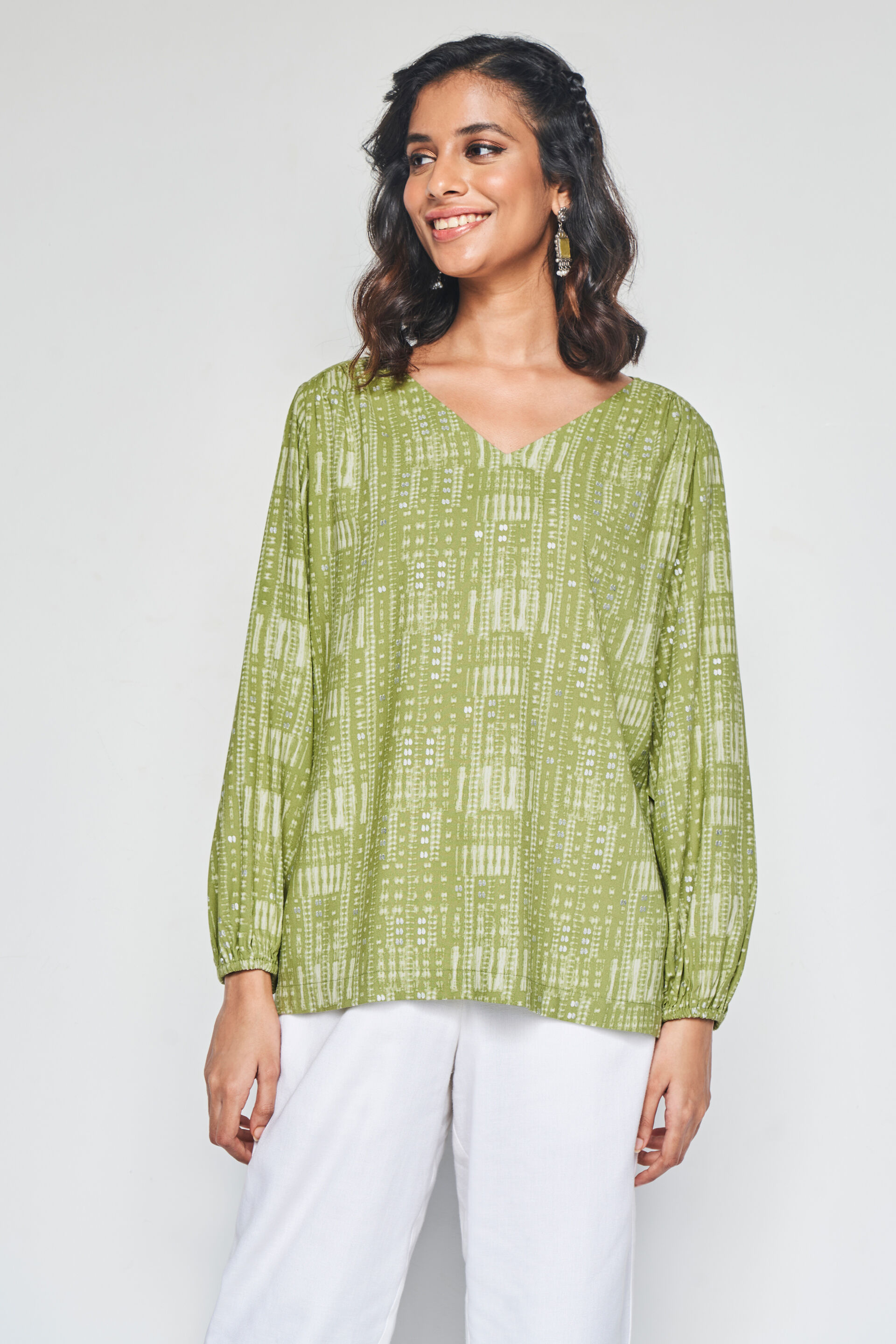 This lightweight top comes with a V-neckline and puff sleeves. It features a subtle geometric print all over.