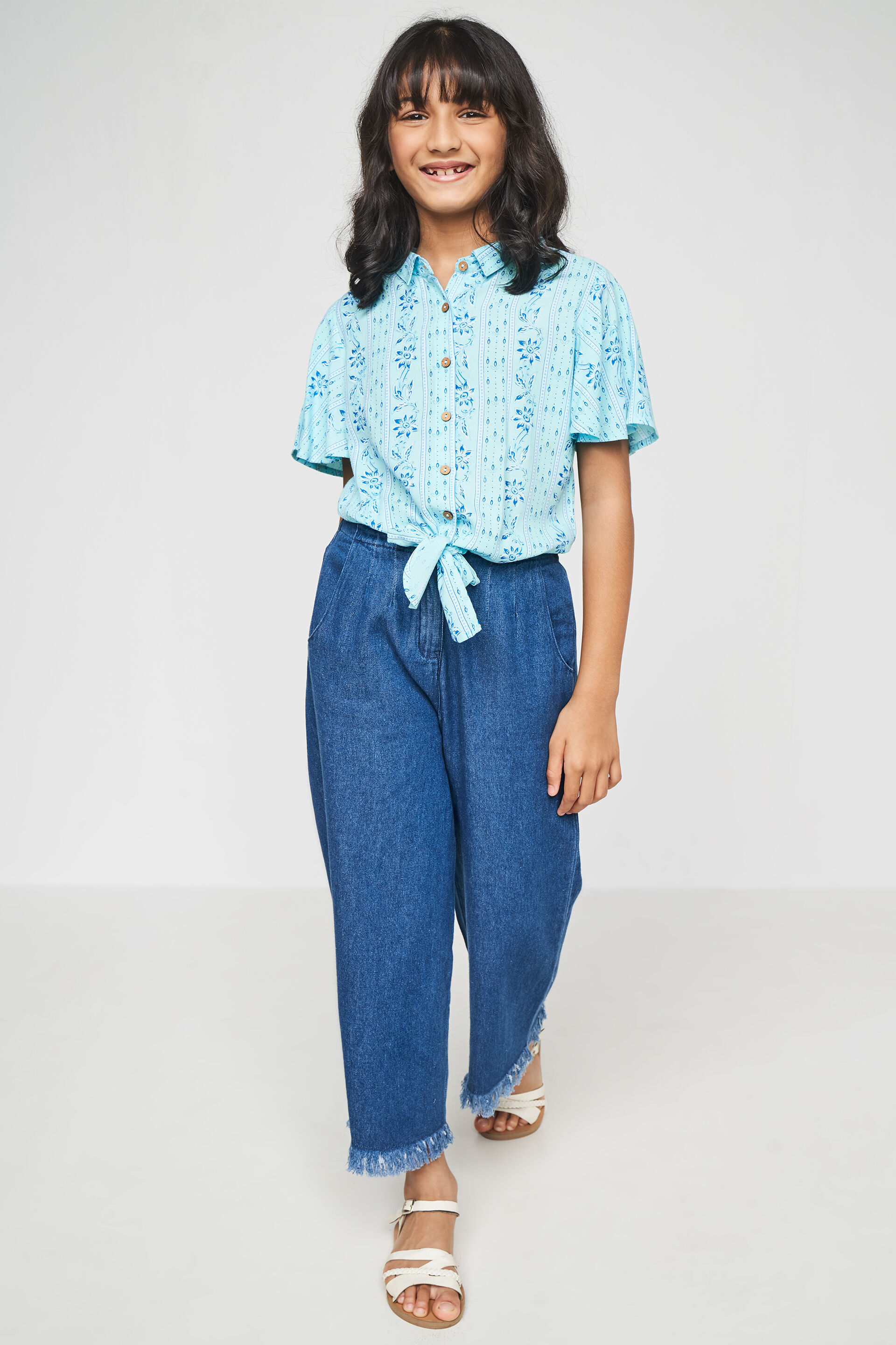 Get her summer beach party-ready with this cooling aqua blue tie-up shirt for girls from Global Desi. Made from good quality viscose fabric in floral print, the shirt features short bell sleeves and a fabric tie-up belt at the hemline. Pair this cute top with comfy wide-leg denim, sandals and a beaded necklace.